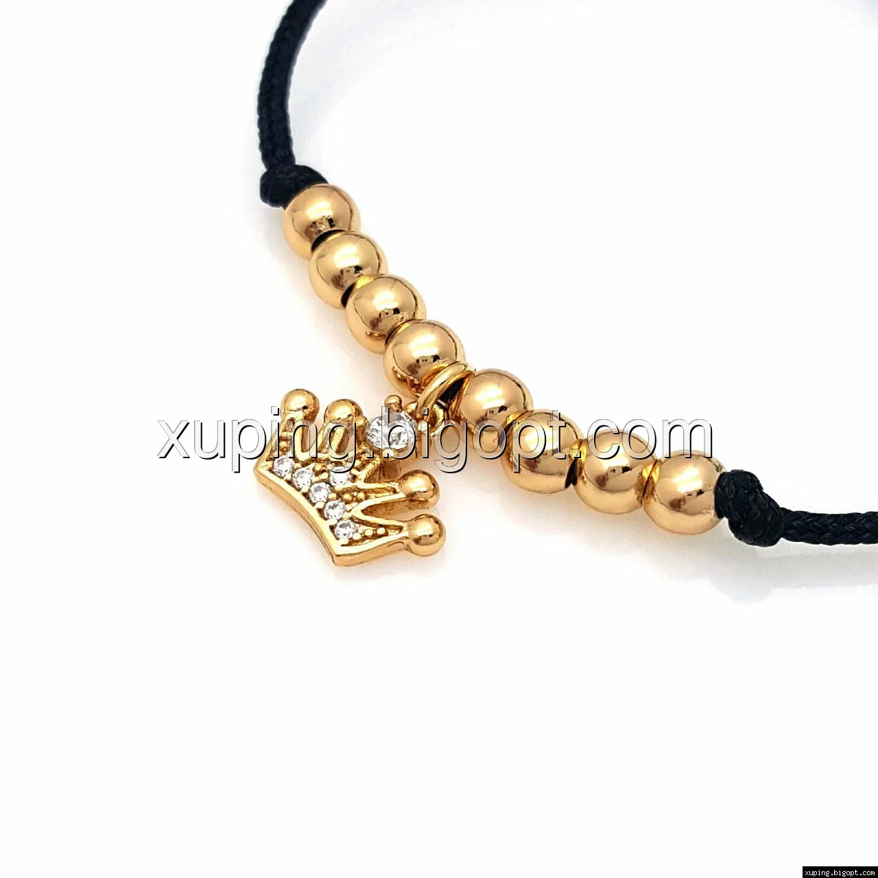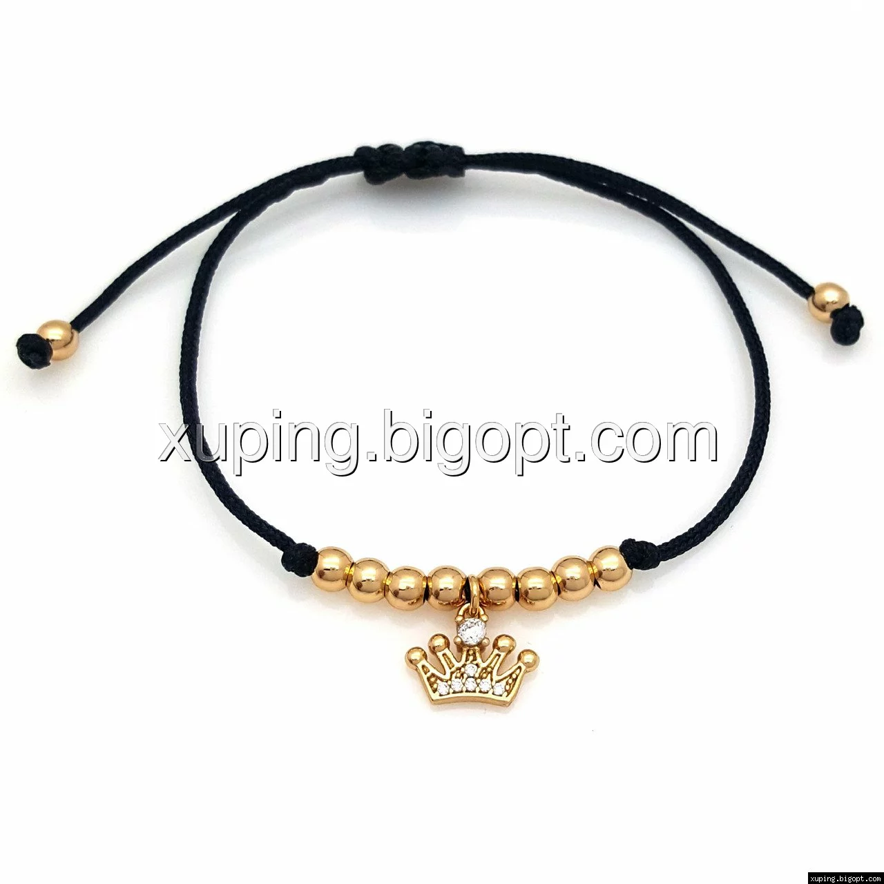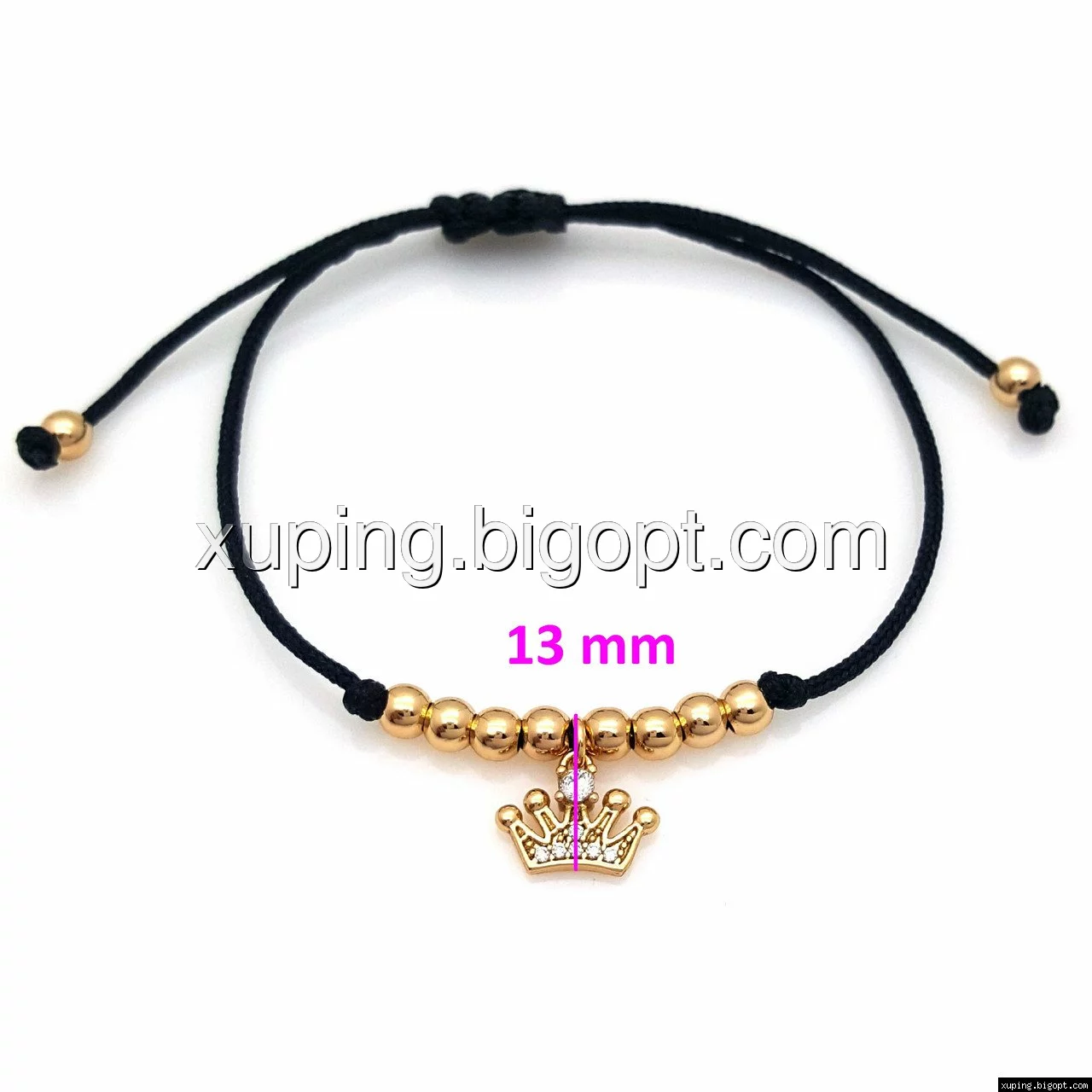 Браслет Черная Шелковая ниточка с шарами и короной, вставка цирконий, позолота