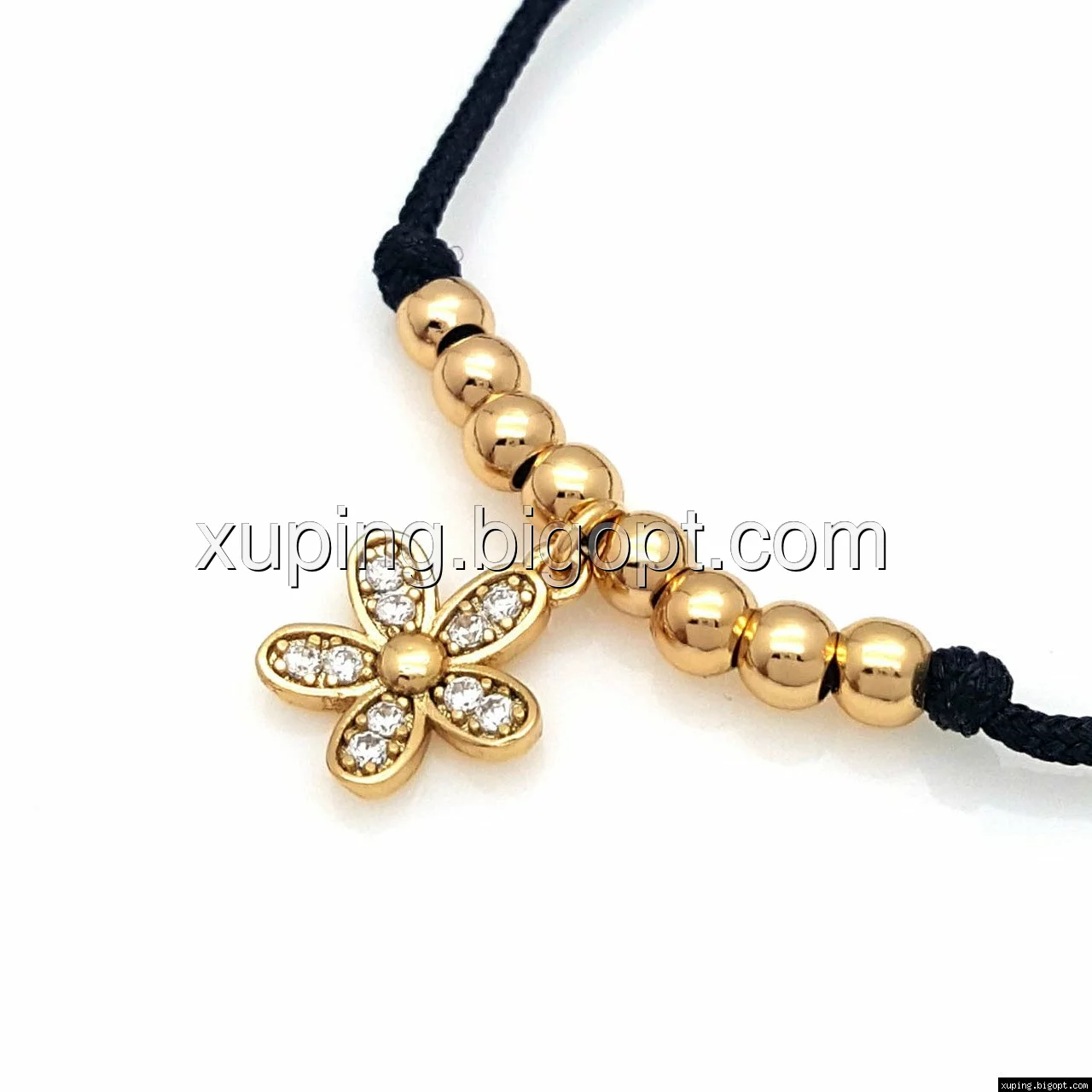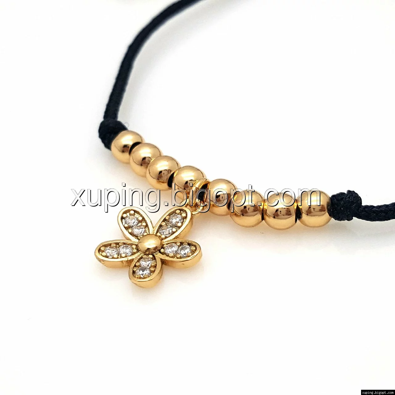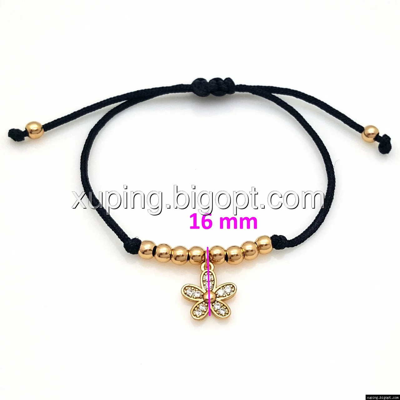 Браслет Черная шелковая ниточка, с шарами и цветком, россыпи циркония, позолота