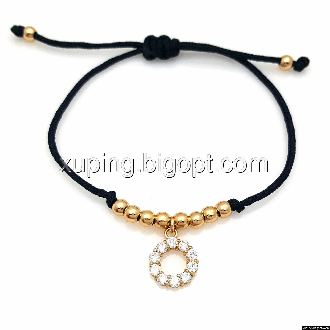Браслет Черная шелковая ниточка, с шарами со вставкой циркония, позолота