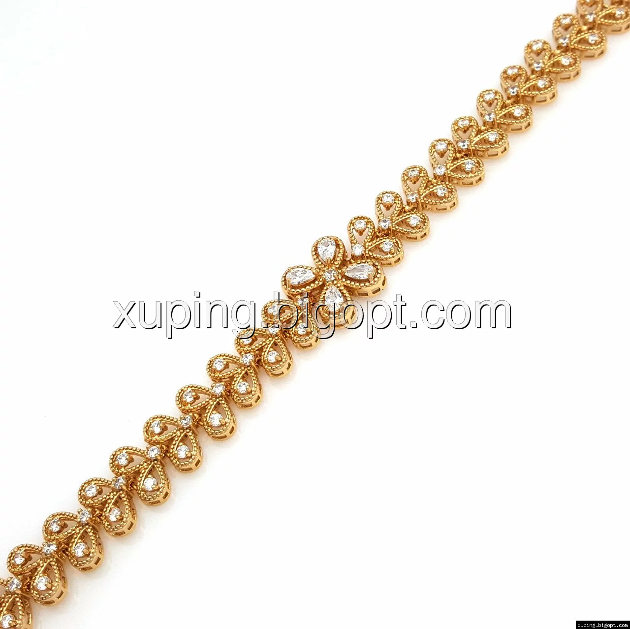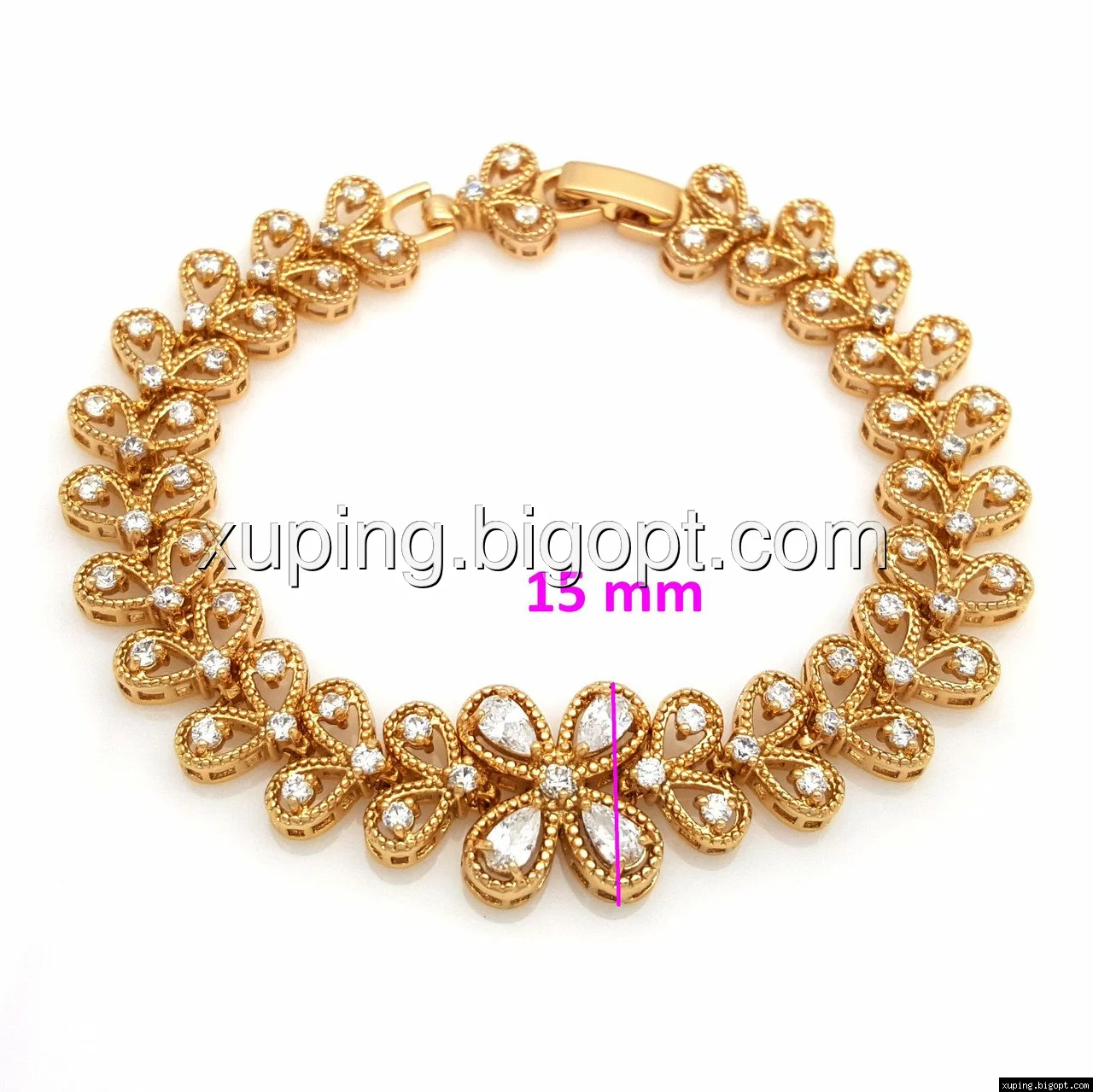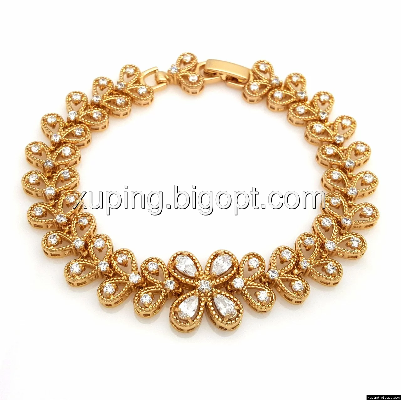 Браслет выполнен из медицинского сплава, который  изготовляется на основе латуни. Сверху бижутерия покрыта позолотой  для того чтобы придать ей насыщенный цвет, яркий блеск и максимальное сходство с золотом. Кроме того, в качестве декора мастера используют цирконий, который крепится при помощи крапанов. Как известно этот камень широко применяется в ювелирном искусстве, так как он обладает восхитительным блеском и прочностью. Данная бижутерия представлена заводом-производителем марки «Xuping» – все изделия оригинальны и имеют одинаково высокое качество.