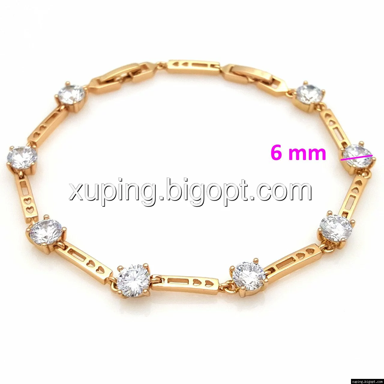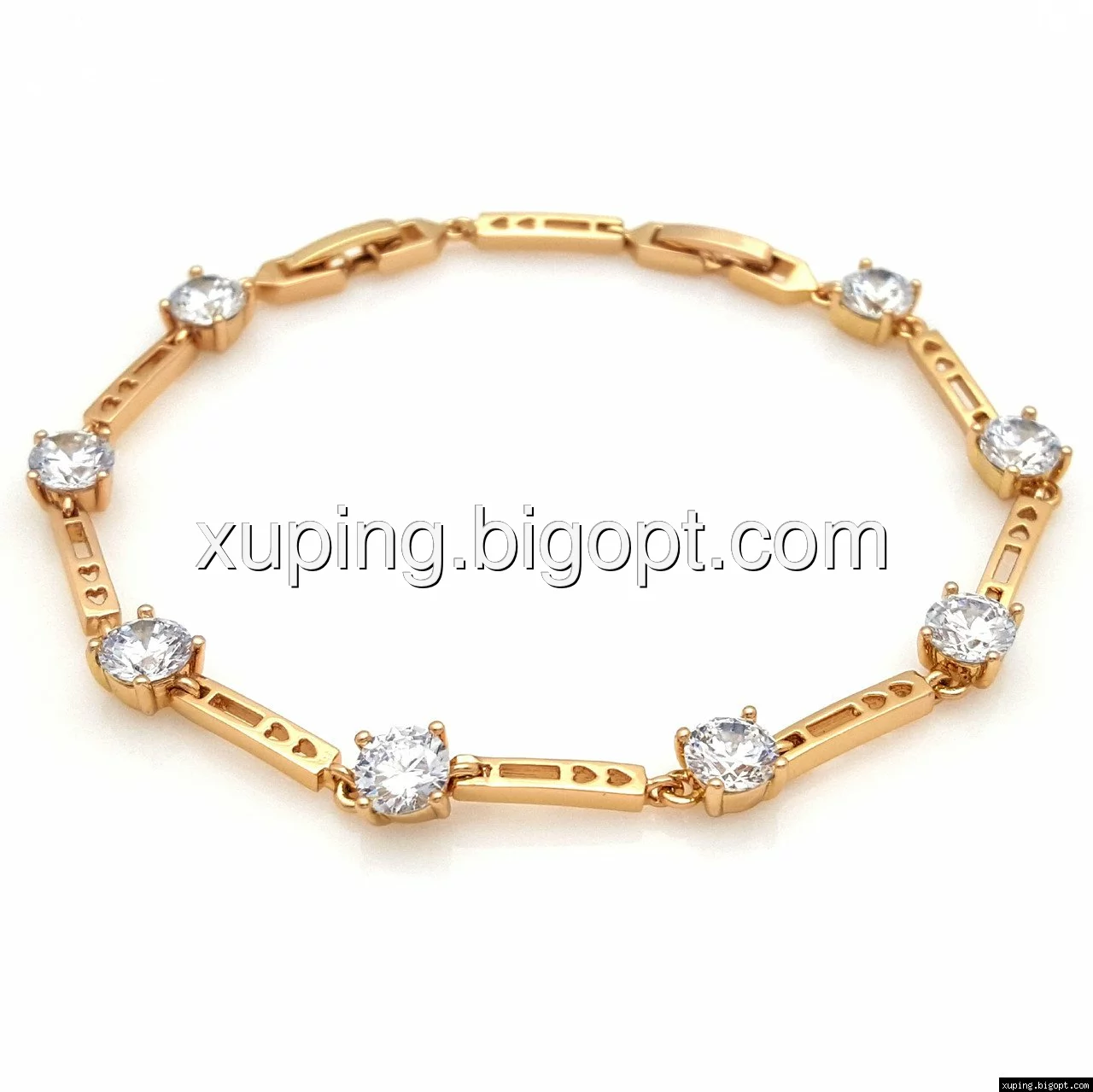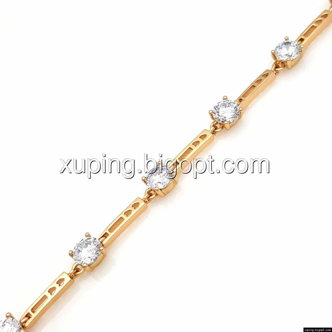 Браслет выполнен из медицинского сплава, который  изготовляется на основе латуни. Сверху бижутерия покрыта позолотой  для того чтобы придать ей насыщенный цвет, яркий блеск и максимальное сходство с золотом. Кроме того, в качестве декора мастера используют цирконий, который крепится при помощи клапанов. Как известно этот камень широко применяется в ювелирном искусстве, так как он обладает восхитительным блеском и прочностью. Данная бижутерия представлена заводом-производителем марки «Xuping» – все изделия оригинальны и имеют одинаково высокое качество.