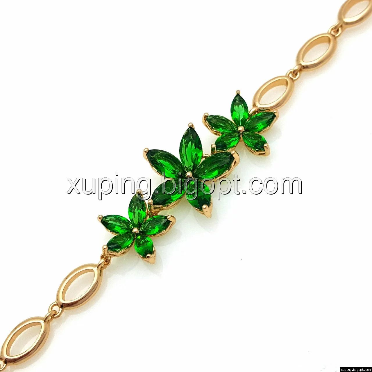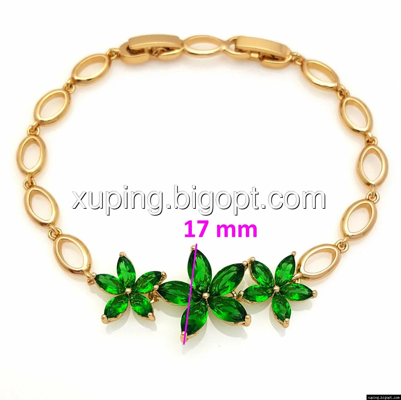 Браслет Три Цветка, с зеленым цирконием, р.17, р.19,5, позолота Xuping
