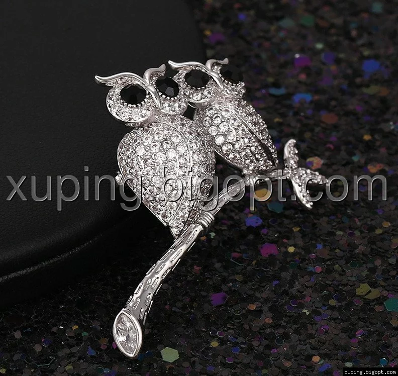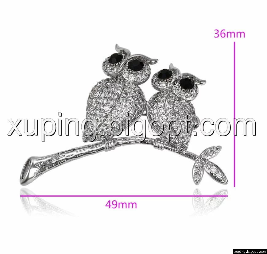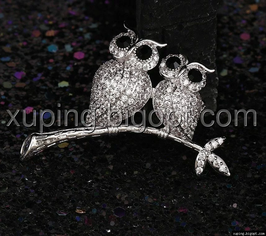 Брошка Дві сови з розсипом цирконію, родій