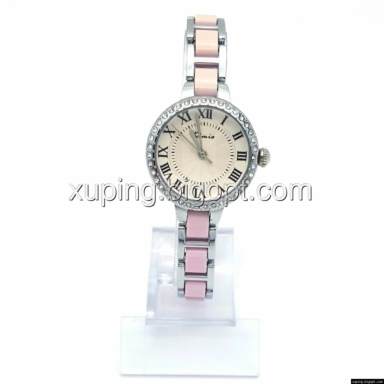 Часы KIMIO Серебристый, с розовой вставкой и камнями, длина браслета 19см, циферблат 27мм