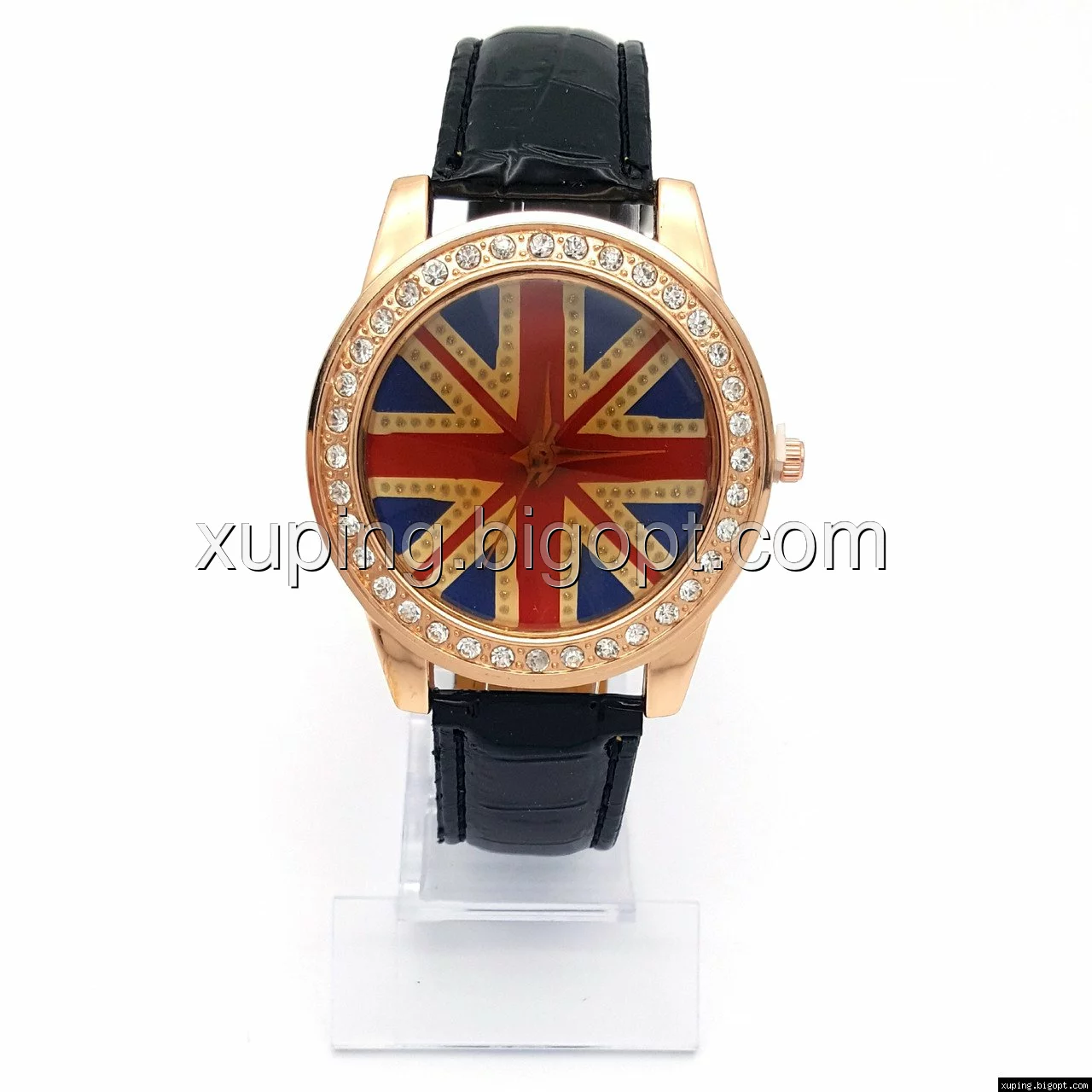 Часы с Английским флагом в стразах, на черном ремешке, длина ремешка 19-22см, циферблат - 42мм