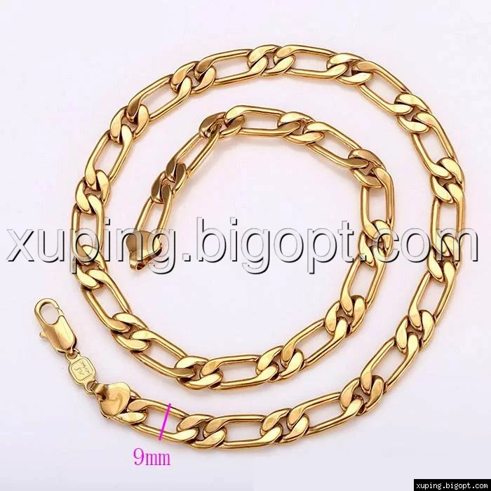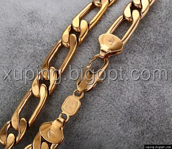 Цепочка выполнена из медицинского сплава на основе латуни с добавлением легирующих елементов, с целью улучшения каких-либо ее свойств, например коррозионной стойкости или прочности. Такой сплав не вызывает аллергии, не вступает в реакцию с потом человека, не меняет свои свойства под воздействием соленой воды и солнца. Поверхность цепочки покрыта золотом 18 карата.