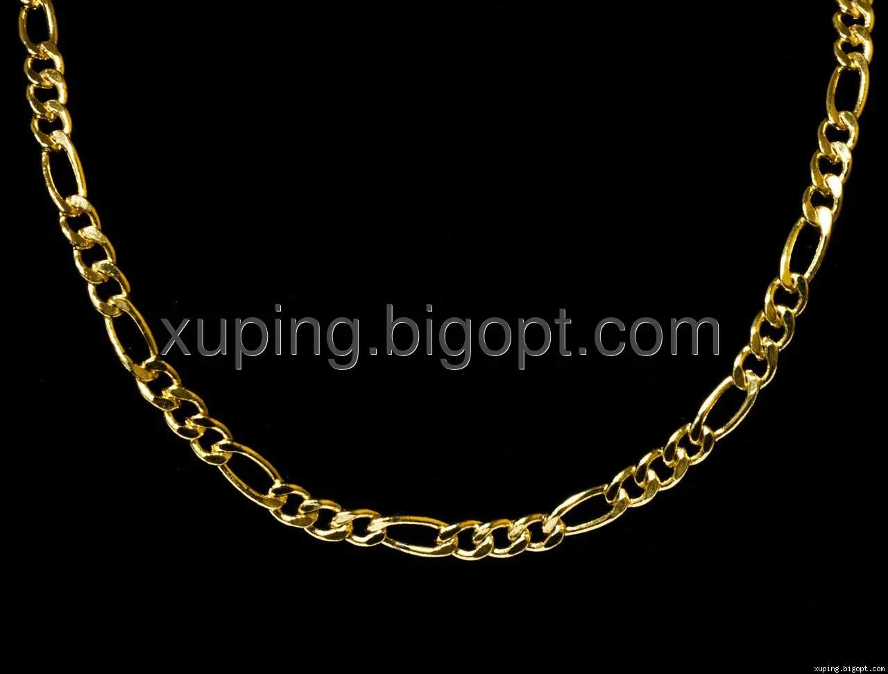 Цепочка выполнена из медицинского сплава на основе латуни с добавлением легирующих елементов, с целью улучшения каких-либо ее свойств, например коррозионной стойкости или прочности. Такой сплав не вызывает аллергии, не вступает в реакцию с потом человека, не меняет свои свойства под воздействием соленой воды и солнца. Поверхность цепочки покрыта золотом 12 карата.