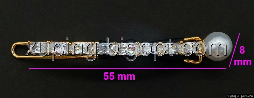Заколка выполнена из медицинского сплава на основе латуни с добавлением легирующих элементов, с целью улучшения каких-либо его свойств, например коррозионной стойкости или прочности. Такой сплав не вызывает аллергии, не вступает в реакцию с потом человека, не меняет свои свойства под воздействием соленой воды и солнца. Поверхность заколки покрыта золотом 18 карата.