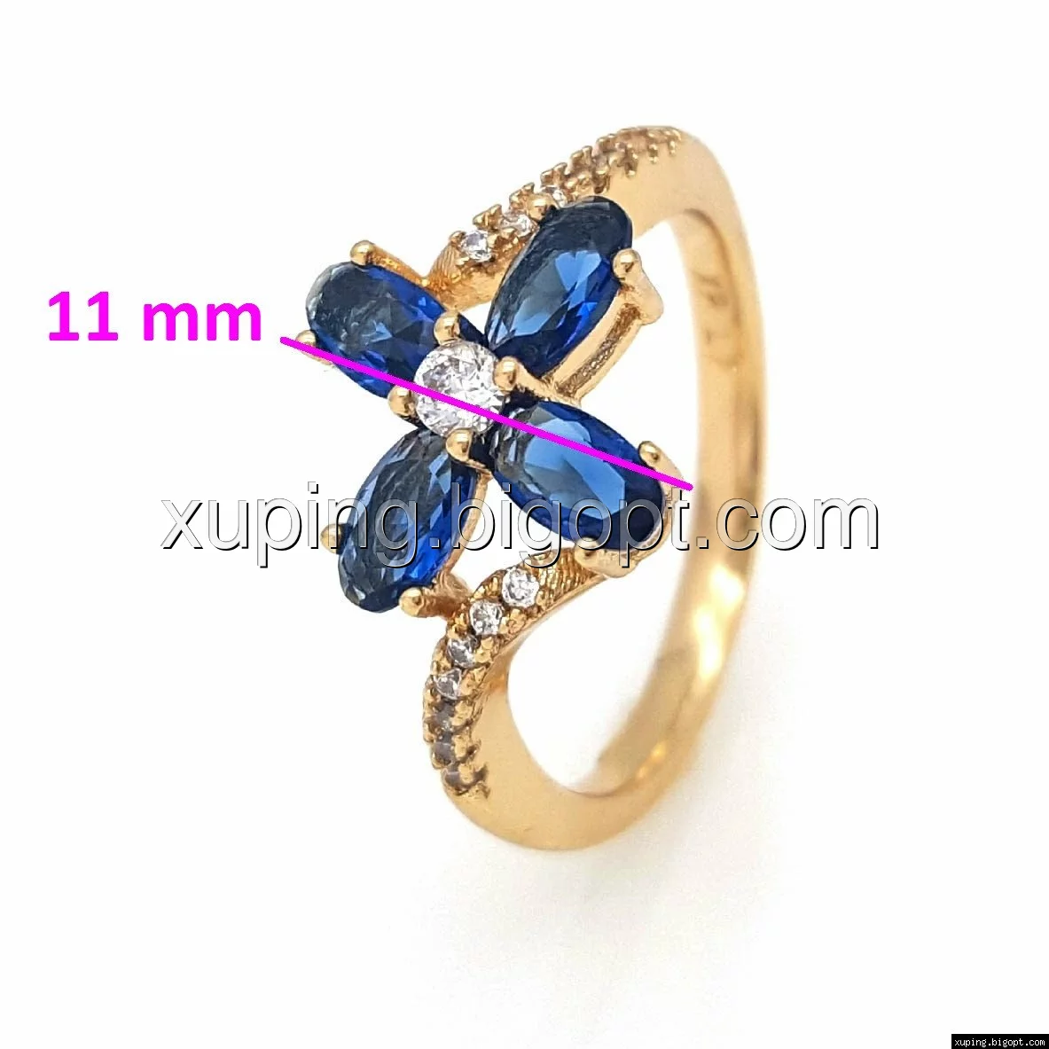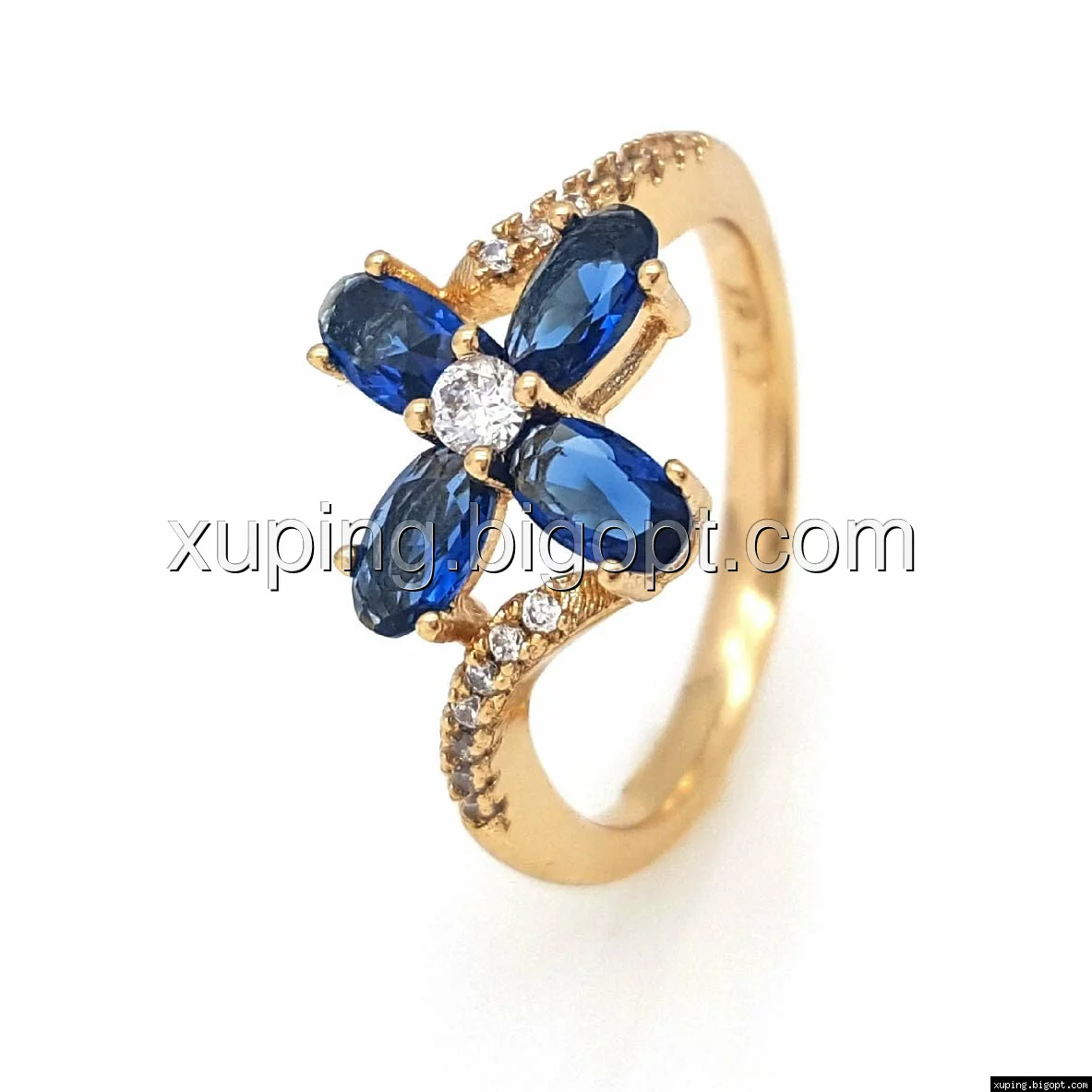 Кольцо Четырехлистник с синим цирконием, р.17, р.18, р.19, р.19,5, позолота Xuping