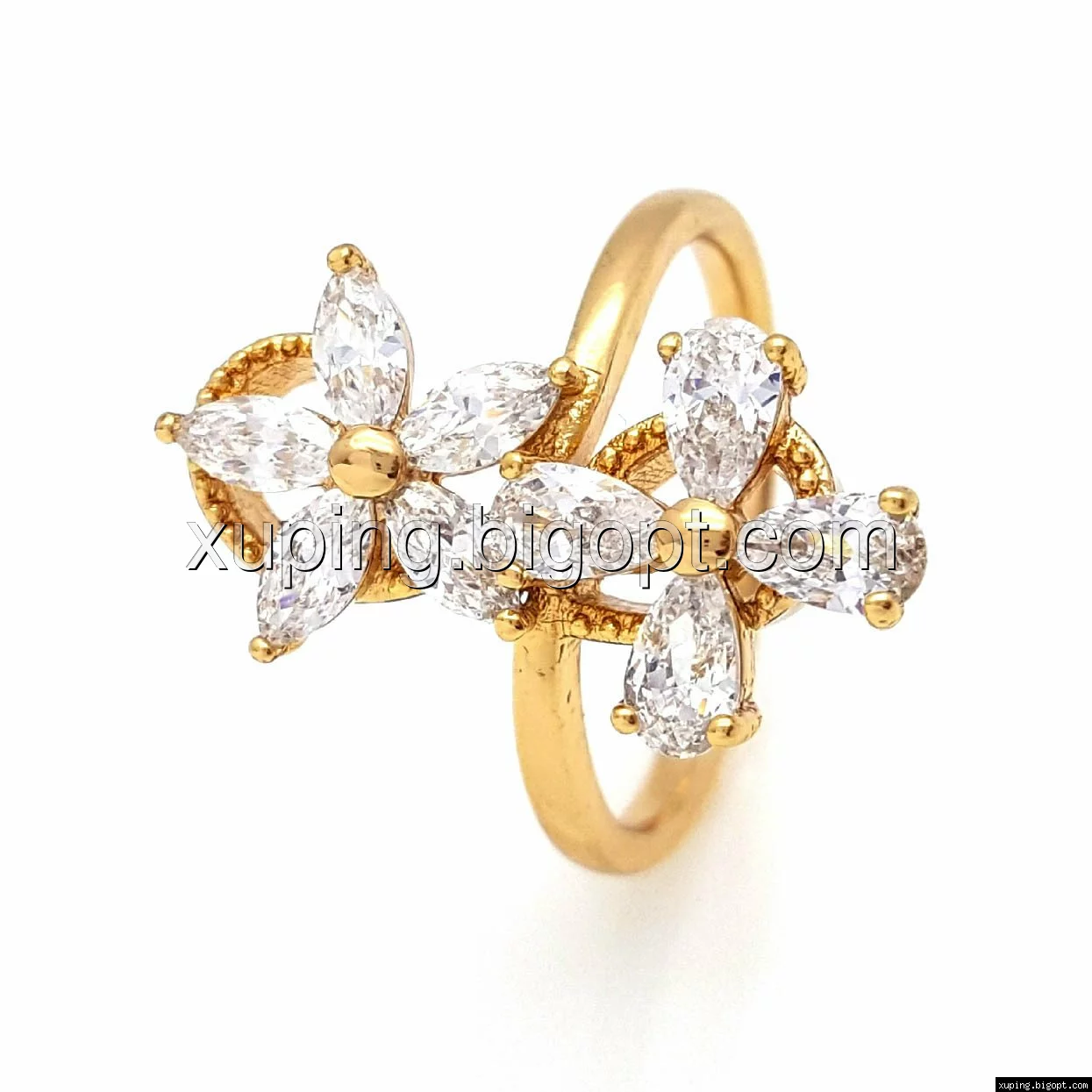 Кольцо Два Цветка, с граненным цирконием, р.17, р.18, р.18,5, р.19,5, позолота Xuping