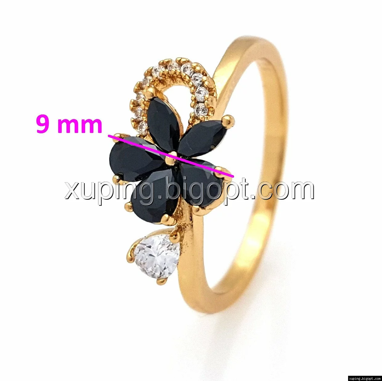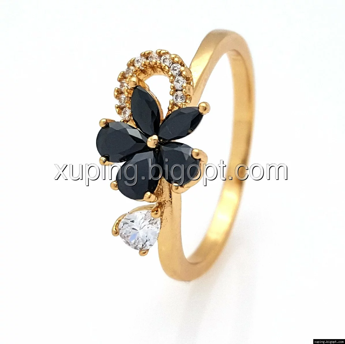 Кольцо позолоченное, Цветочек, с черным цирконием, р.17, р.17,5, р.18,5