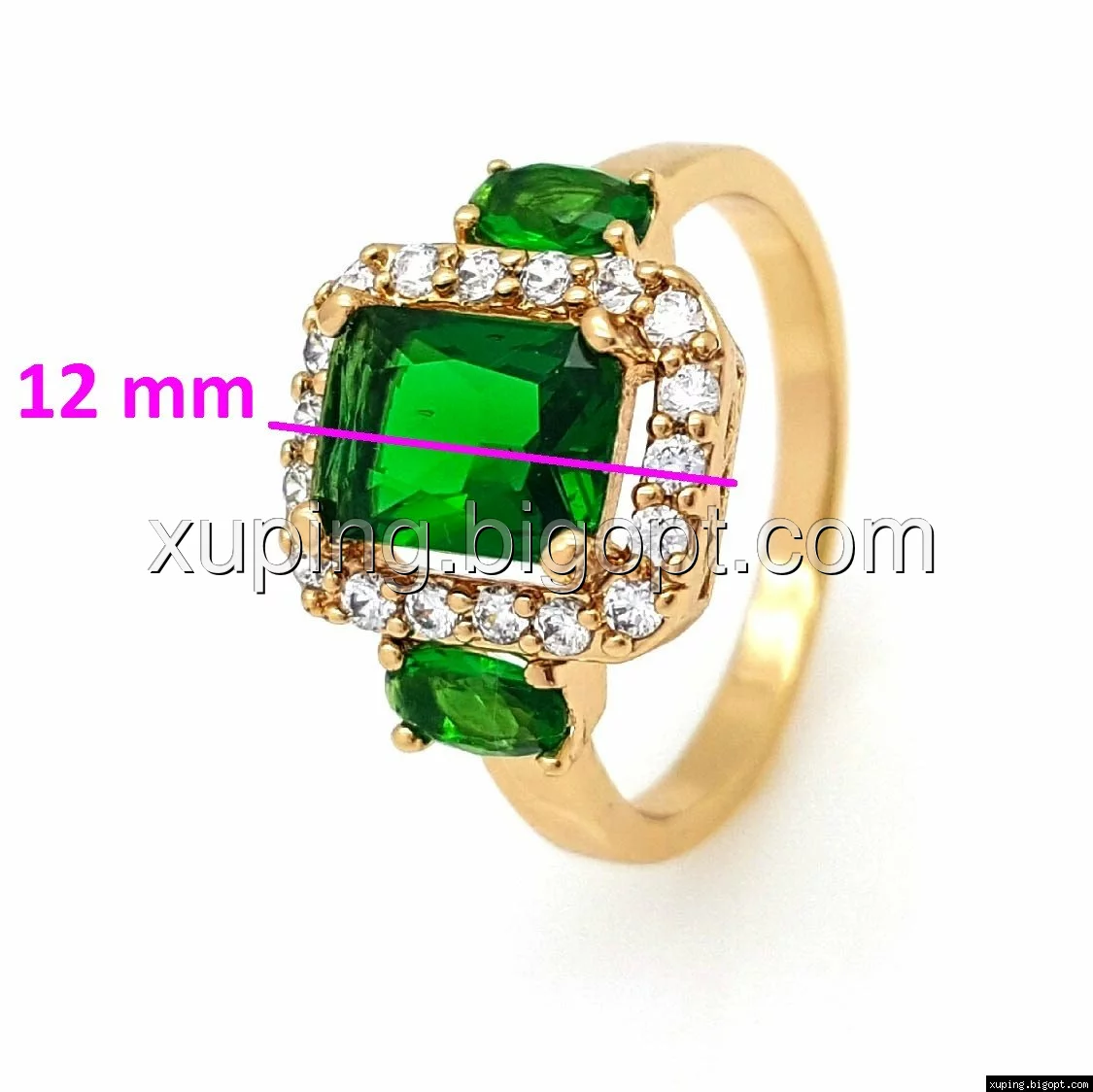 Кольцо позолоченное, Зеленый прямоугольный цирконий, р.17,5, р.18,5