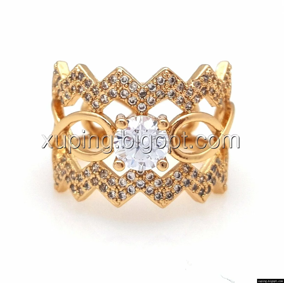 Кольцо позолоченное, Зигзаг с россыпью камнейр.18,5