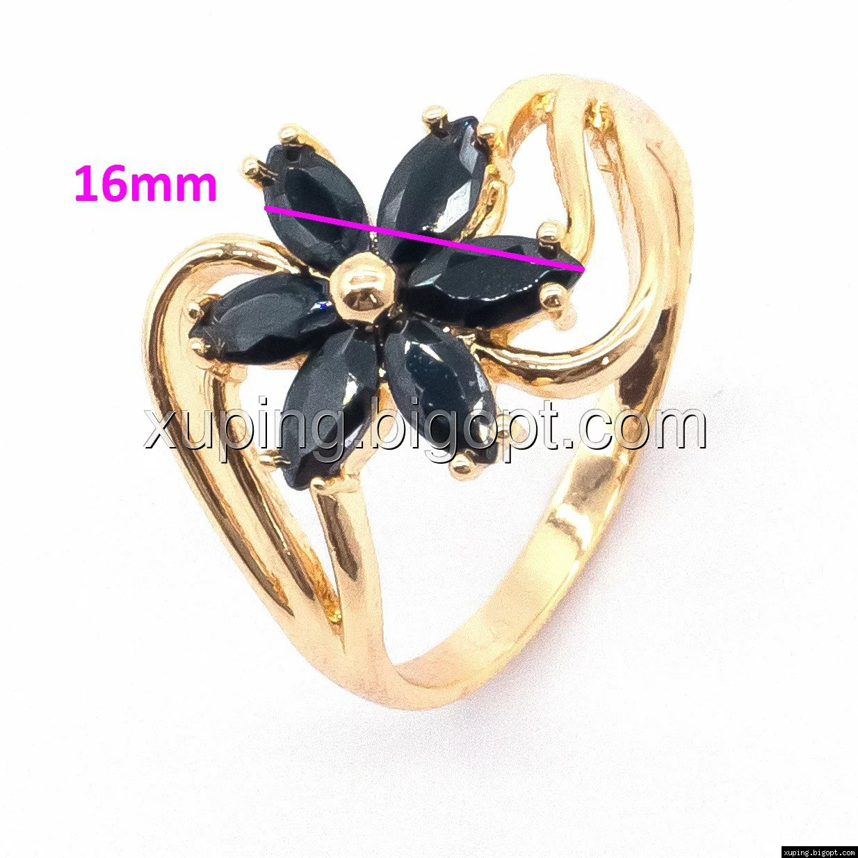 Кольцо Цветок, с черным цирконием, р.19,5, позолота