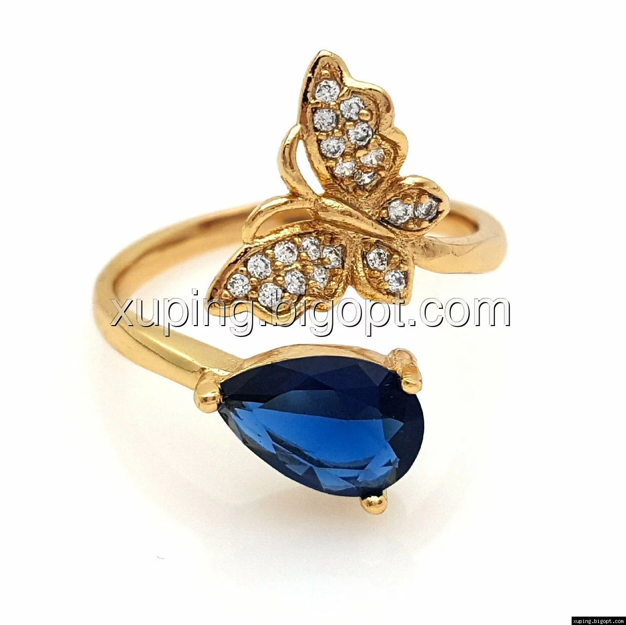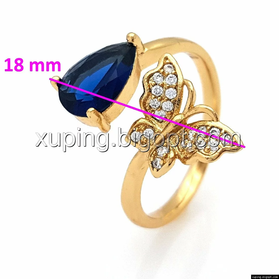 Кольцо Бабочка с Капелькой, вставка синий цирконий, р.16-17, р.18-19, позолота
