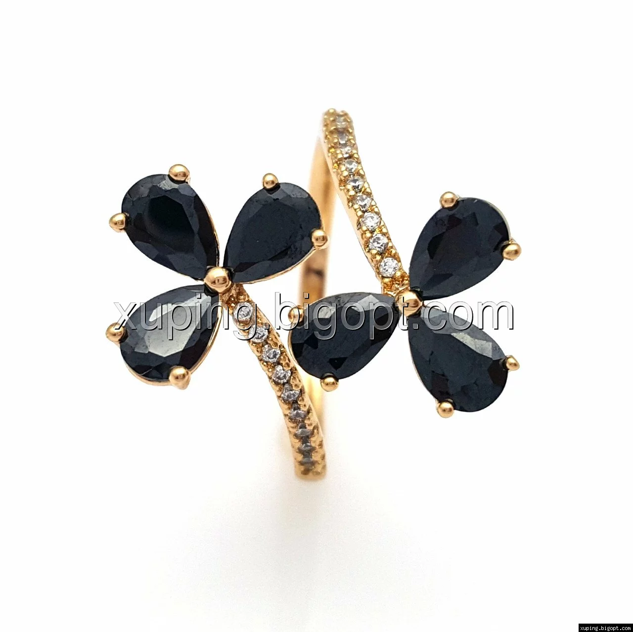 Кольцо Два Цветка, с черным цирконием, р. 16,5, р.18, позолота