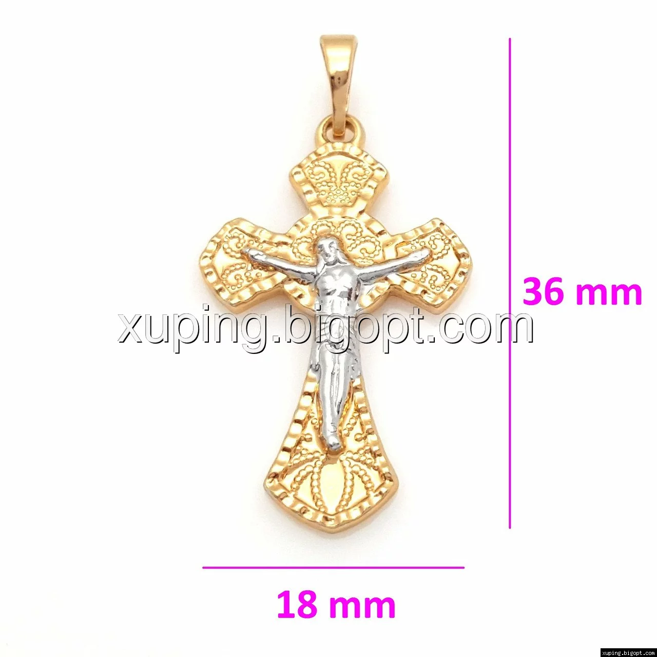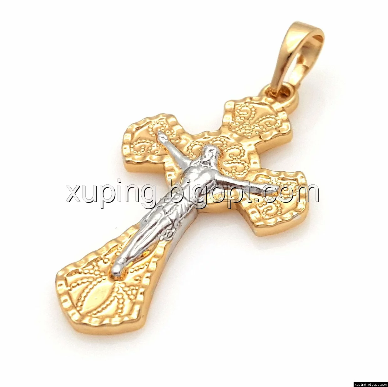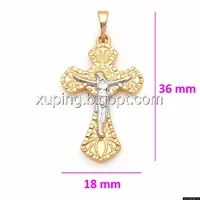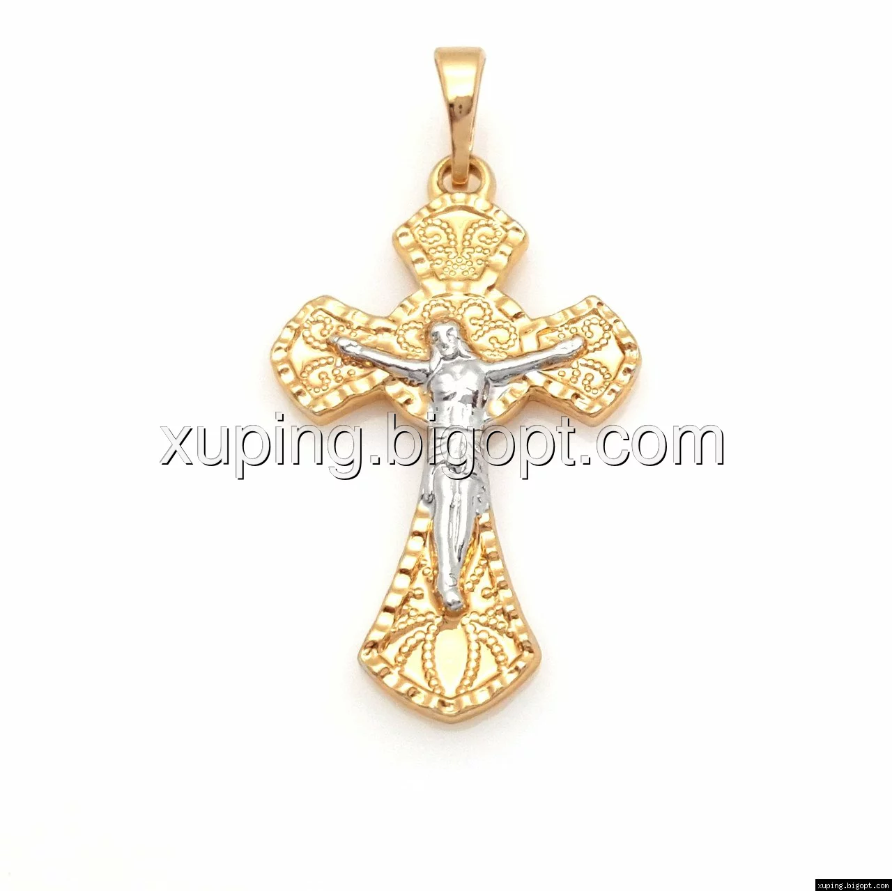 Крест с распятием и узором, без камней, позолота+родий
