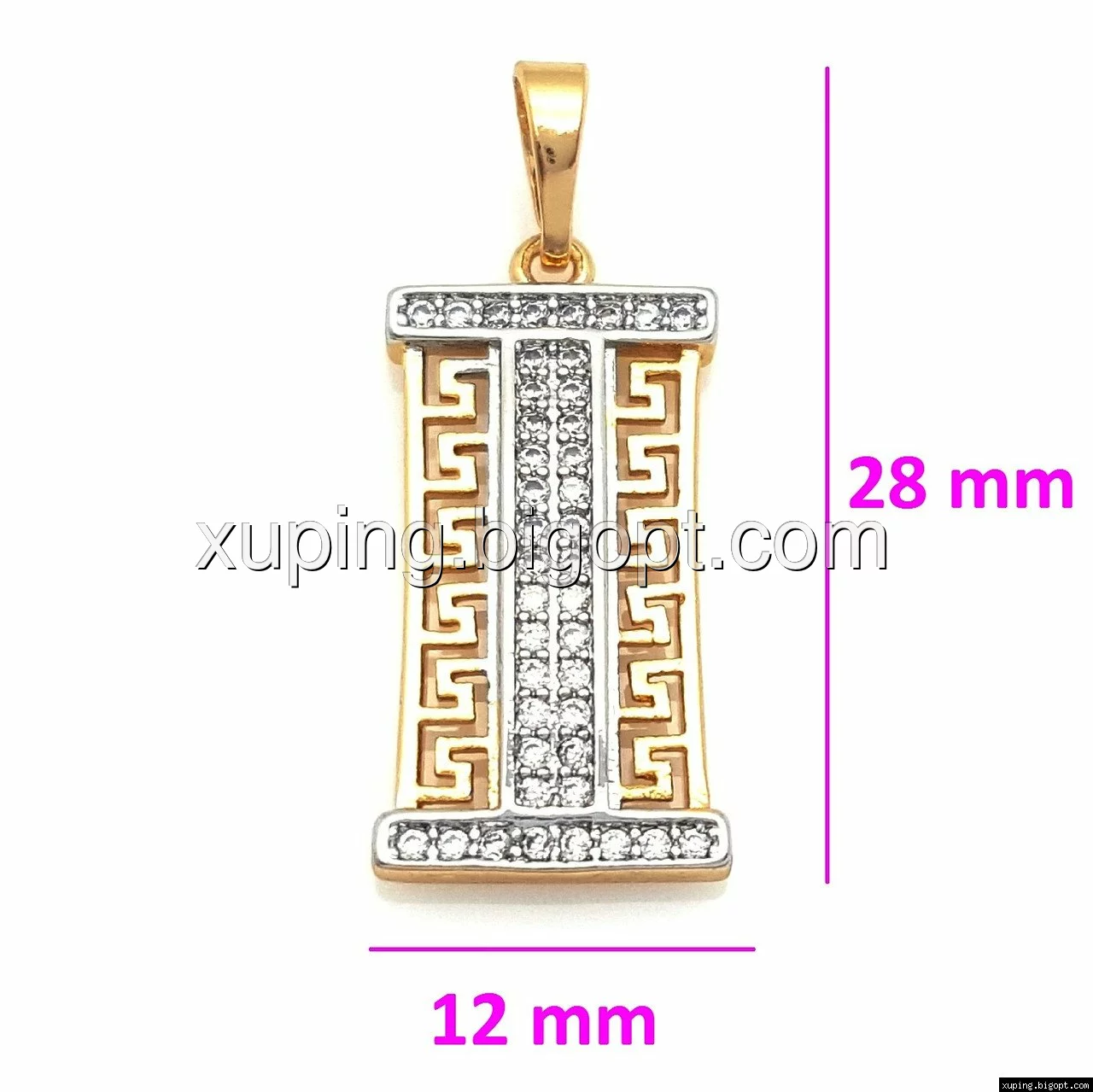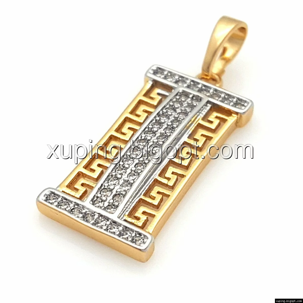 Кулон Прямокутник з грецьким візерунком, розсип каменів, позолота+родій