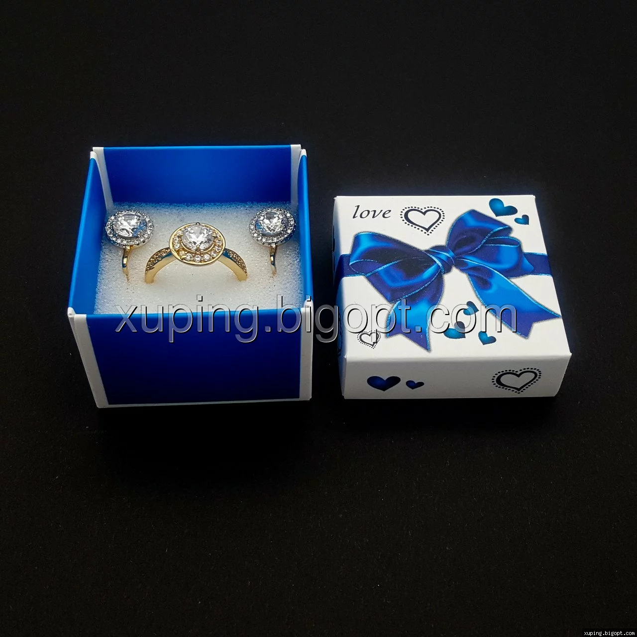 Подарочная коробочка для бижутерии. Подходит для сережек, колечек, кулонов и наборов бижутерии (так как Вы видите на фото). Внутри коробки есть поролоновый вкладыш с прорезью под кольцо и серьги.