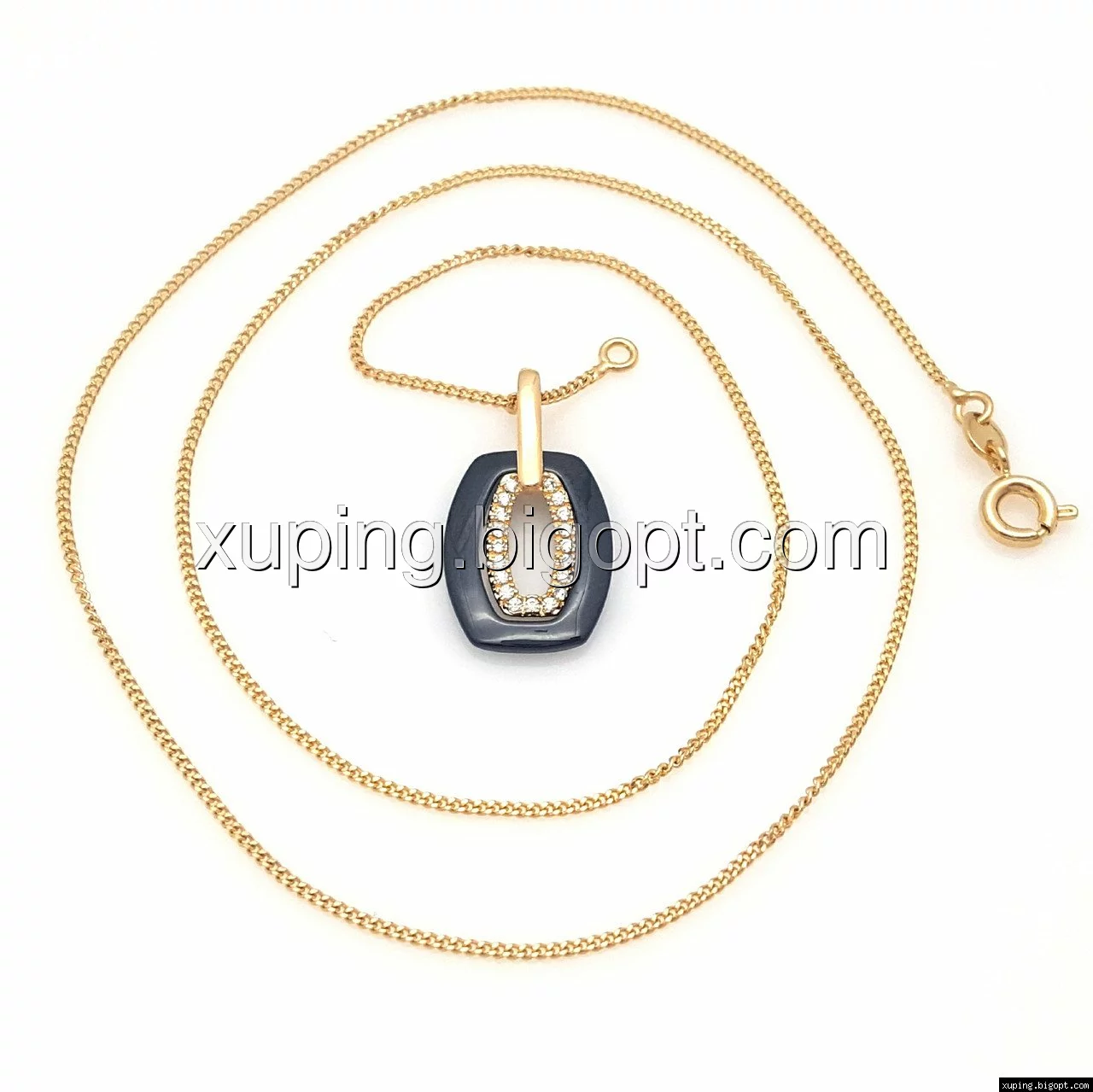 .Подвеска вместе с цепочкой выполнены из медицинского сплава на основе латуни с добавлением легирующих элементов, с целью улучшения каких-либо его свойств, например коррозионной стойкости или прочности. Такой сплав не вызывает аллергии, не вступает в реакцию с потом человека, не меняет свои свойства под воздействием соленой воды и солнца. Поверхность подвески покрыта золотом 24 карата.