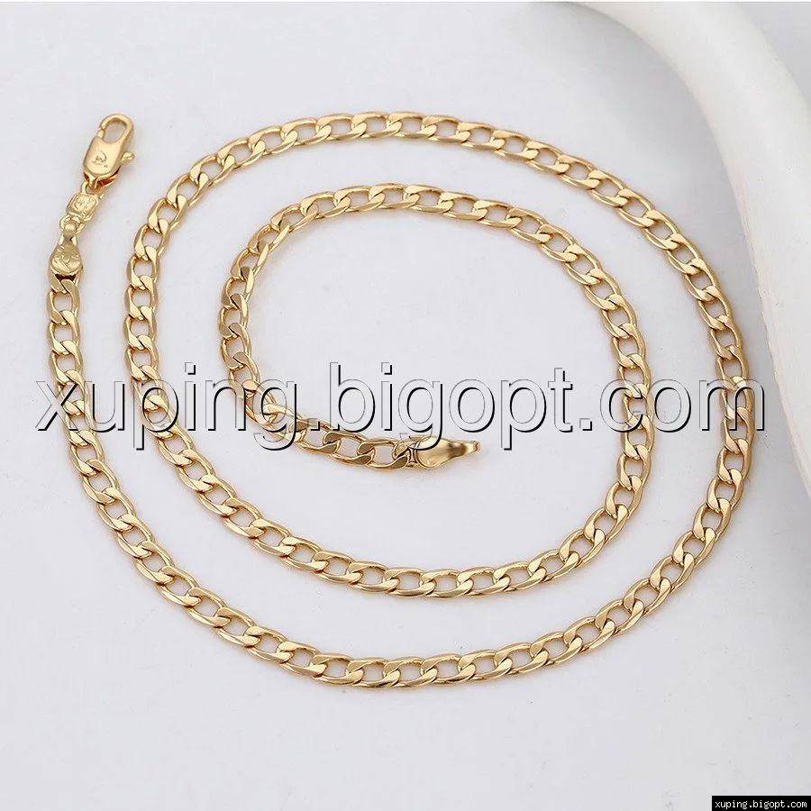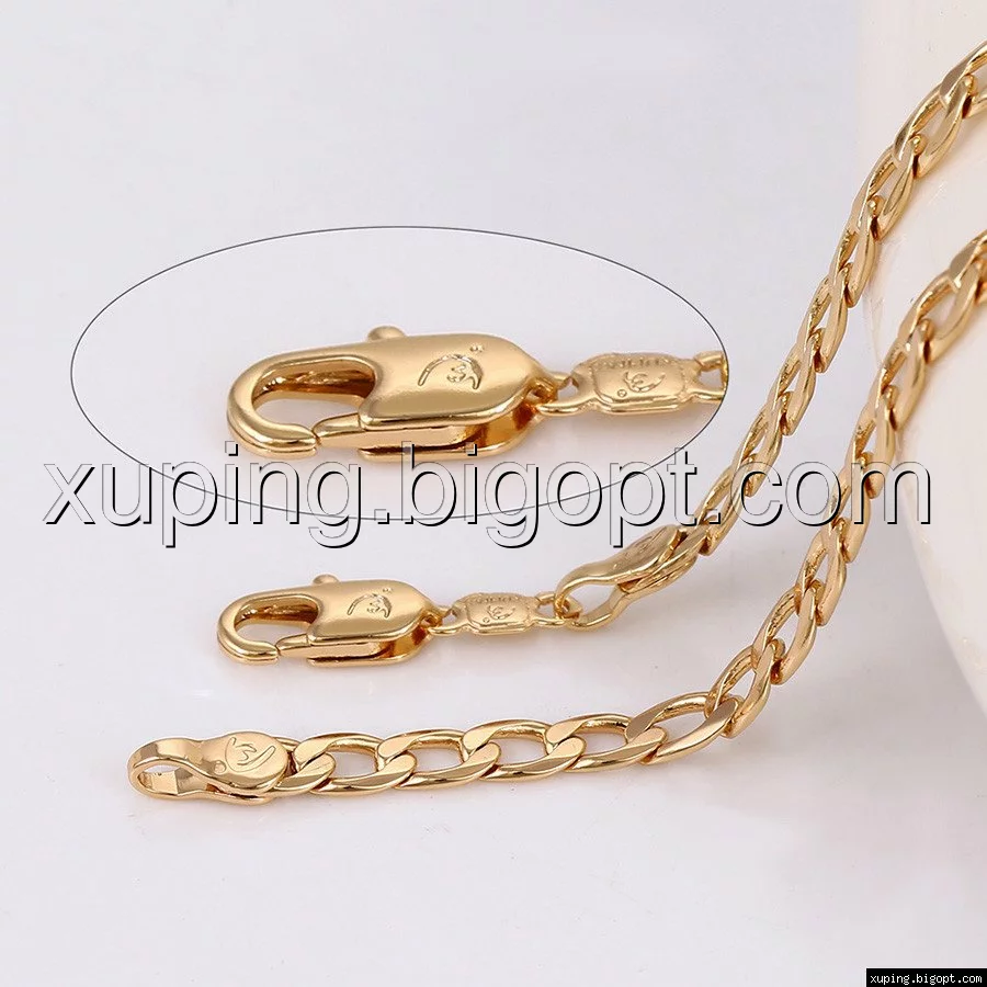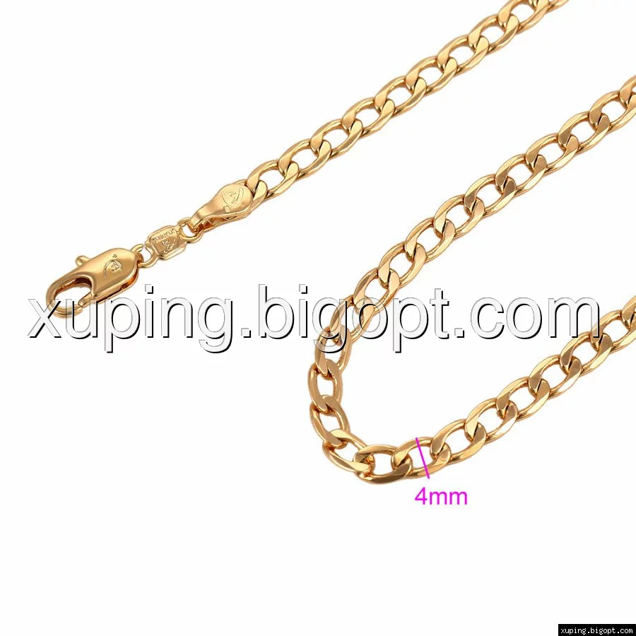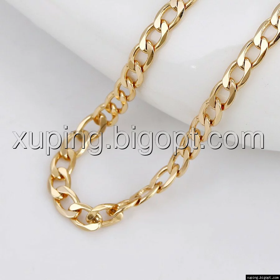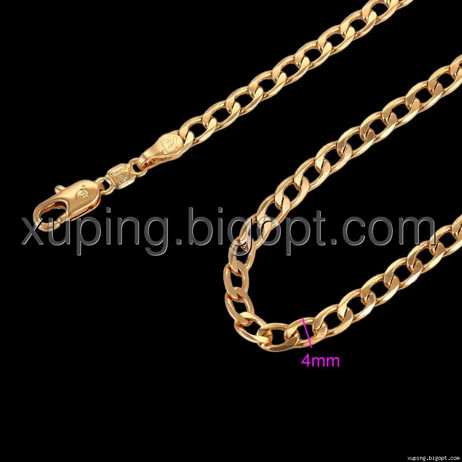 Цепочка выполнена из медицинского сплава на основе латуни с добавлением легирующих элементов, с целью улучшения каких-либо ее свойств, например коррозионной стойкости или прочности. Такой сплав не вызывает аллергии, не вступает в реакцию с потом человека, не меняет свои свойства под воздействием соленой воды и солнца. Поверхность цепочки покрыта золотом 18 карата.