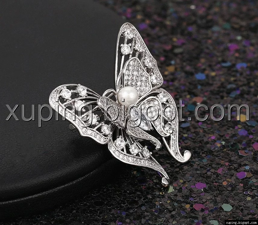 Брошь Бабочка с жемчугом, россипь циркония, родированная