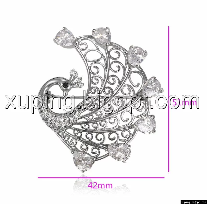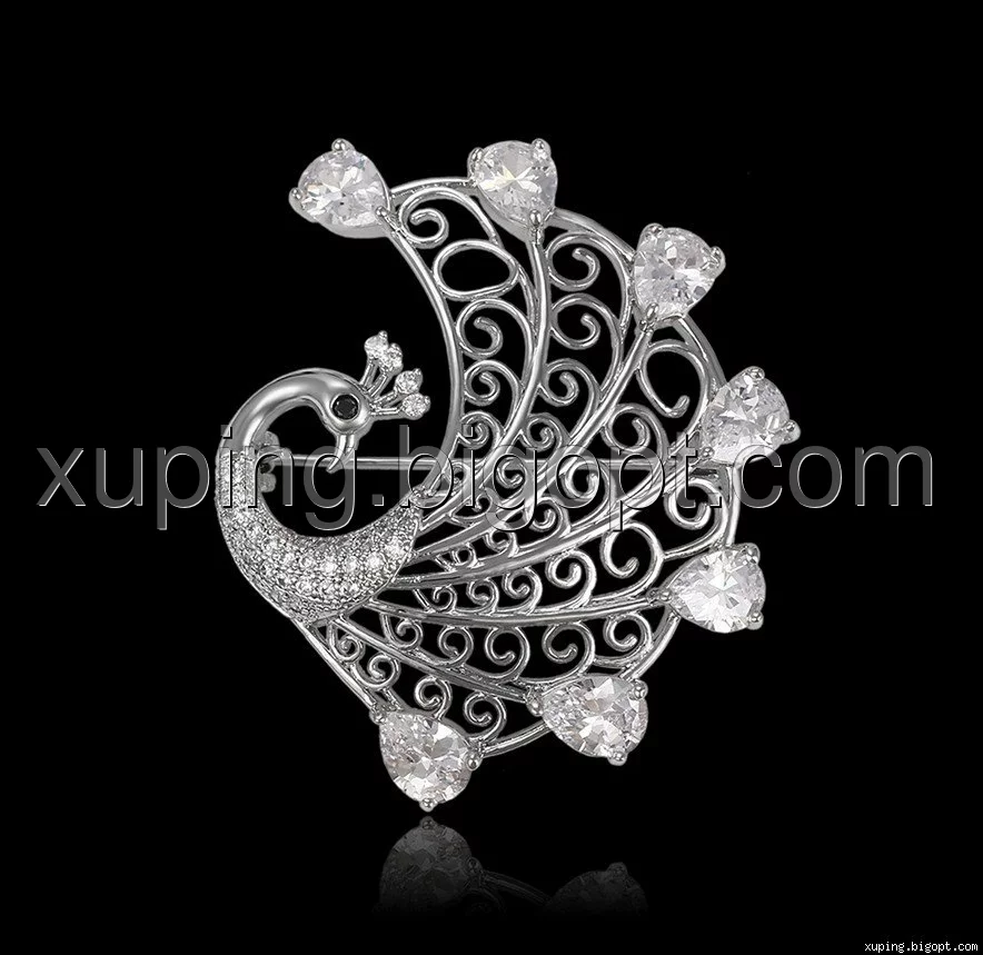Брошь Павлин с цирконием, родированная