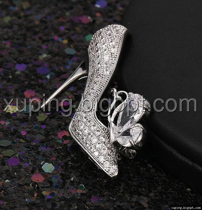 Брошь Туфелька, россипь циркония, родированная