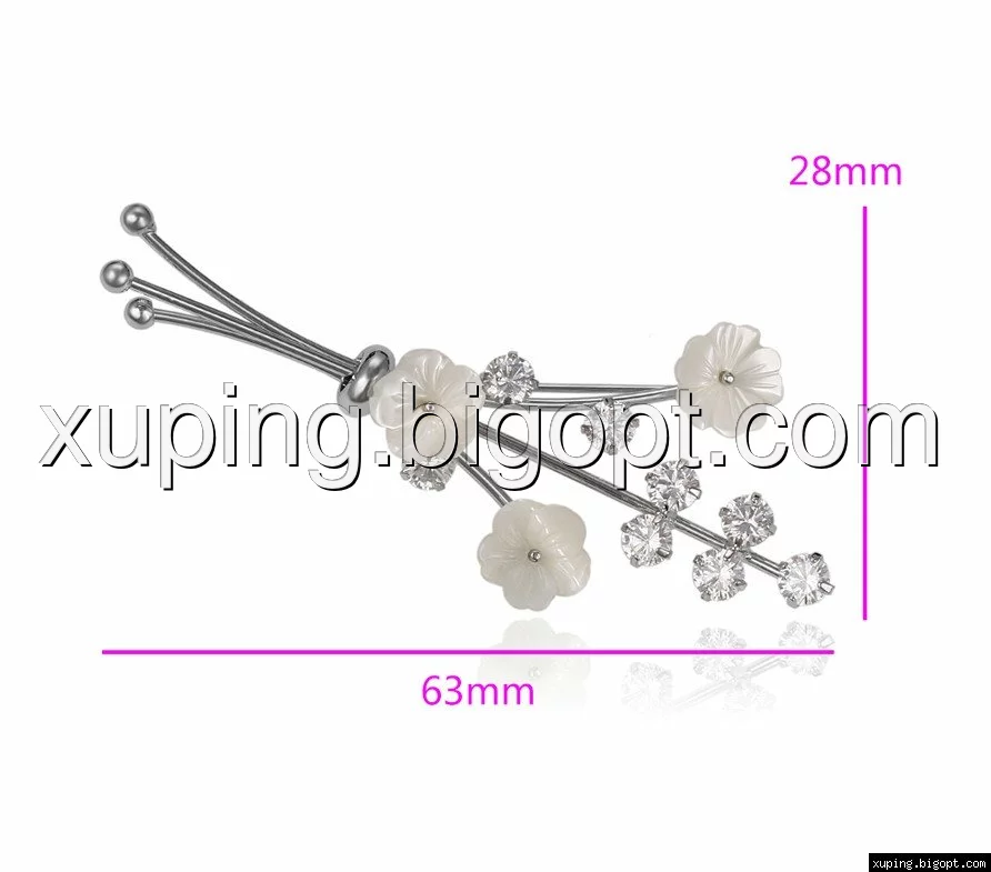 Брошь выполнена из медицинского сплава на основе титана с добавлением легирующих елементов, с целью улучшения каких-либо ее свойств, например коррозионной стойкости или прочности. Такой сплав не вызывает аллергии, не вступает в реакцию с потом человека, не меняет свои свойства под воздействием соленой воды и солнца. Поверхность цепочки покрыта родием чтобы придать ей ярко-белый цвет и дополнительно защитить от повреждений .