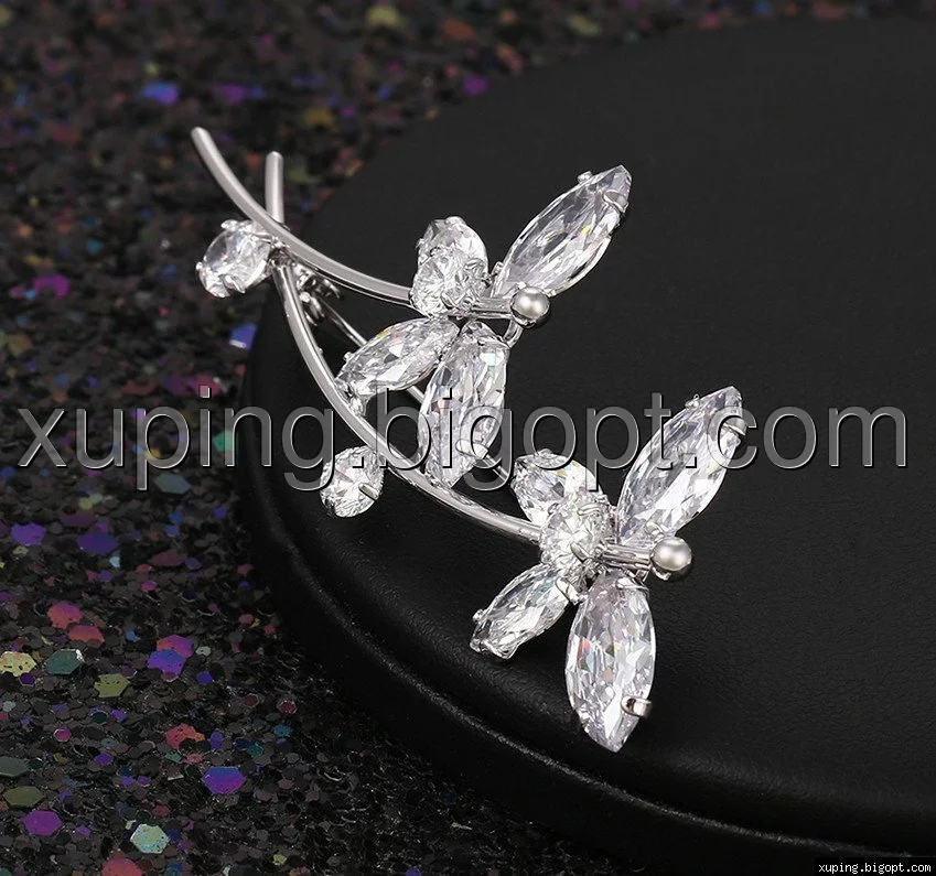 Брошь Два цветка с цирконием, родированная