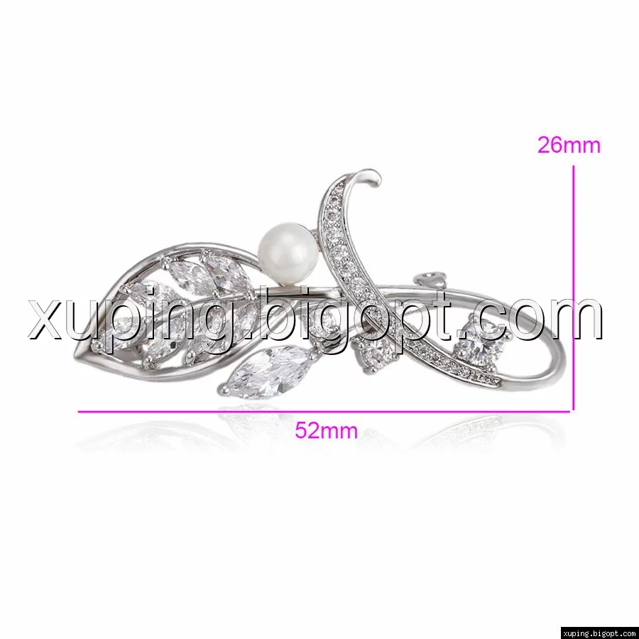 Брошка Родированная, Фигурный листочек с цирконием и жемчугом