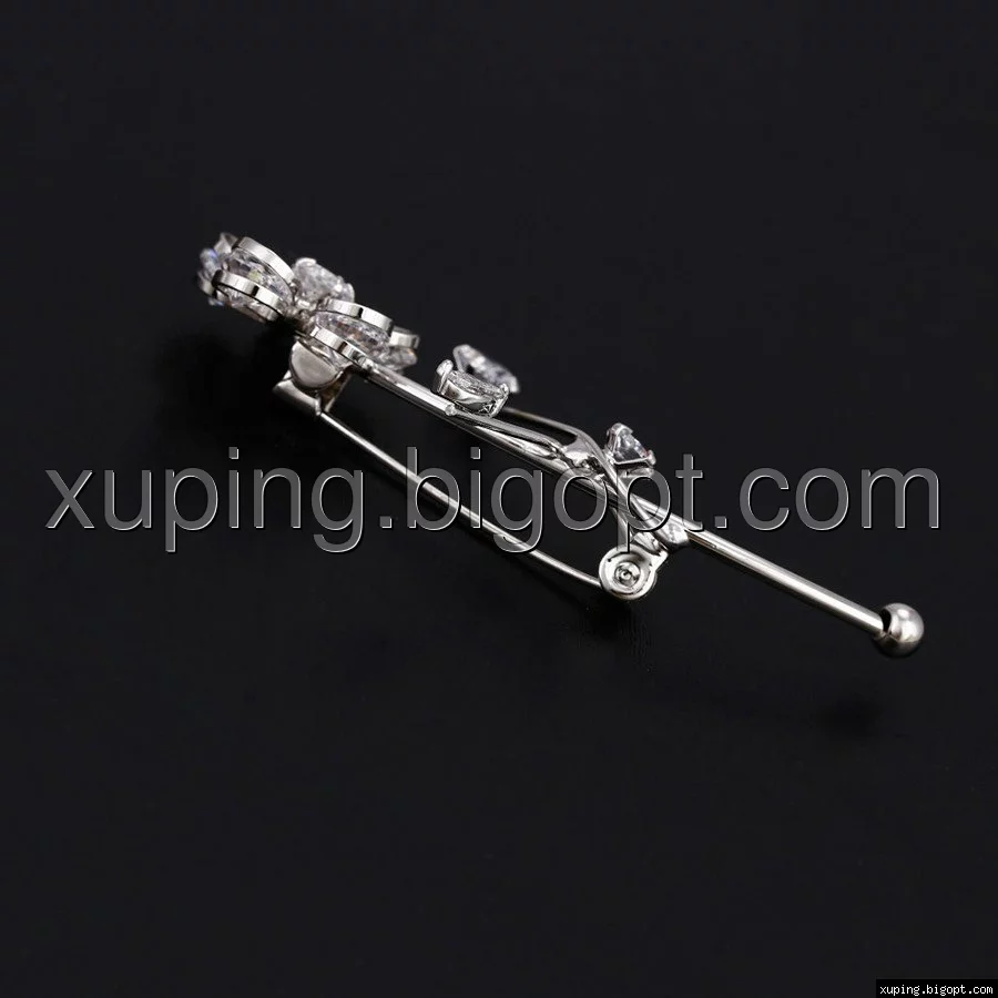 Брошь выполнена из медицинского сплава на основе титана с добавлением легирующих елементов, с целью улучшения каких-либо ее свойств, например коррозионной стойкости или прочности. Такой сплав не вызывает аллергии, не вступает в реакцию с потом человека, не меняет свои свойства под воздействием соленой воды и солнца. Поверхность цепочки покрыта родием чтобы придать ей ярко-белый цвет и дополнительно защитить от повреждений .