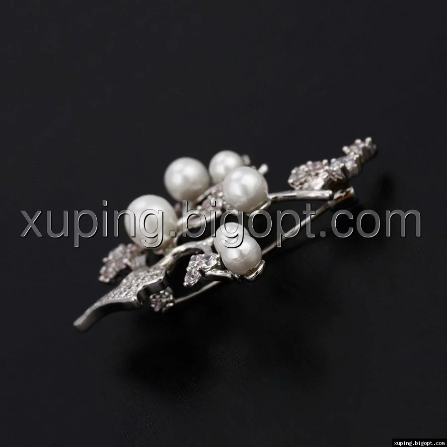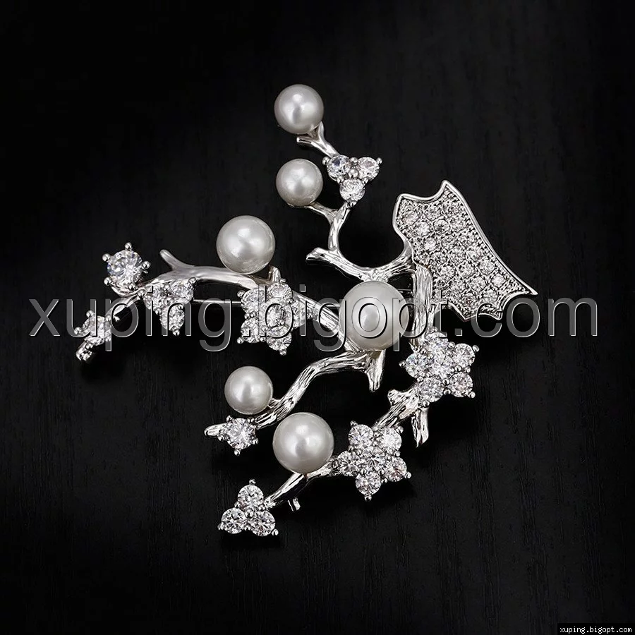 Брошка родированная, Веточка с цирконием и жемчугом