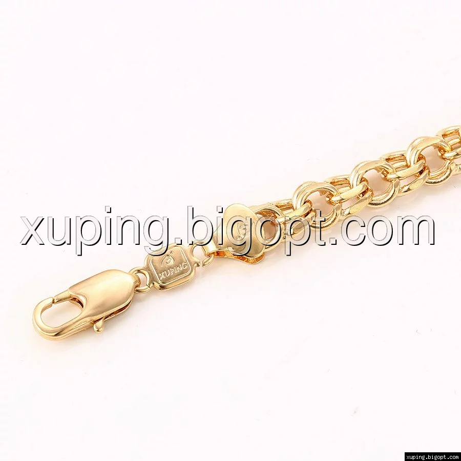 Браслет выполнен из медицинского сплава, который  изготовляется на основе латуни. Сверху бижутерия покрыта позолотой  для того чтобы придать ей насыщенный цвет, яркий блеск и максимальное сходство с золотом. Кроме того, в качестве декора мастера используют цирконий, который крепится при помощи крапанов. Как известно этот камень широко применяется в ювелирном искусстве, так как он обладает восхитительным блеском и прочностью. Данная бижутерия представлена заводом-производителем марки «Xuping» – все изделия оригинальны и имеют одинаково высокое качество.