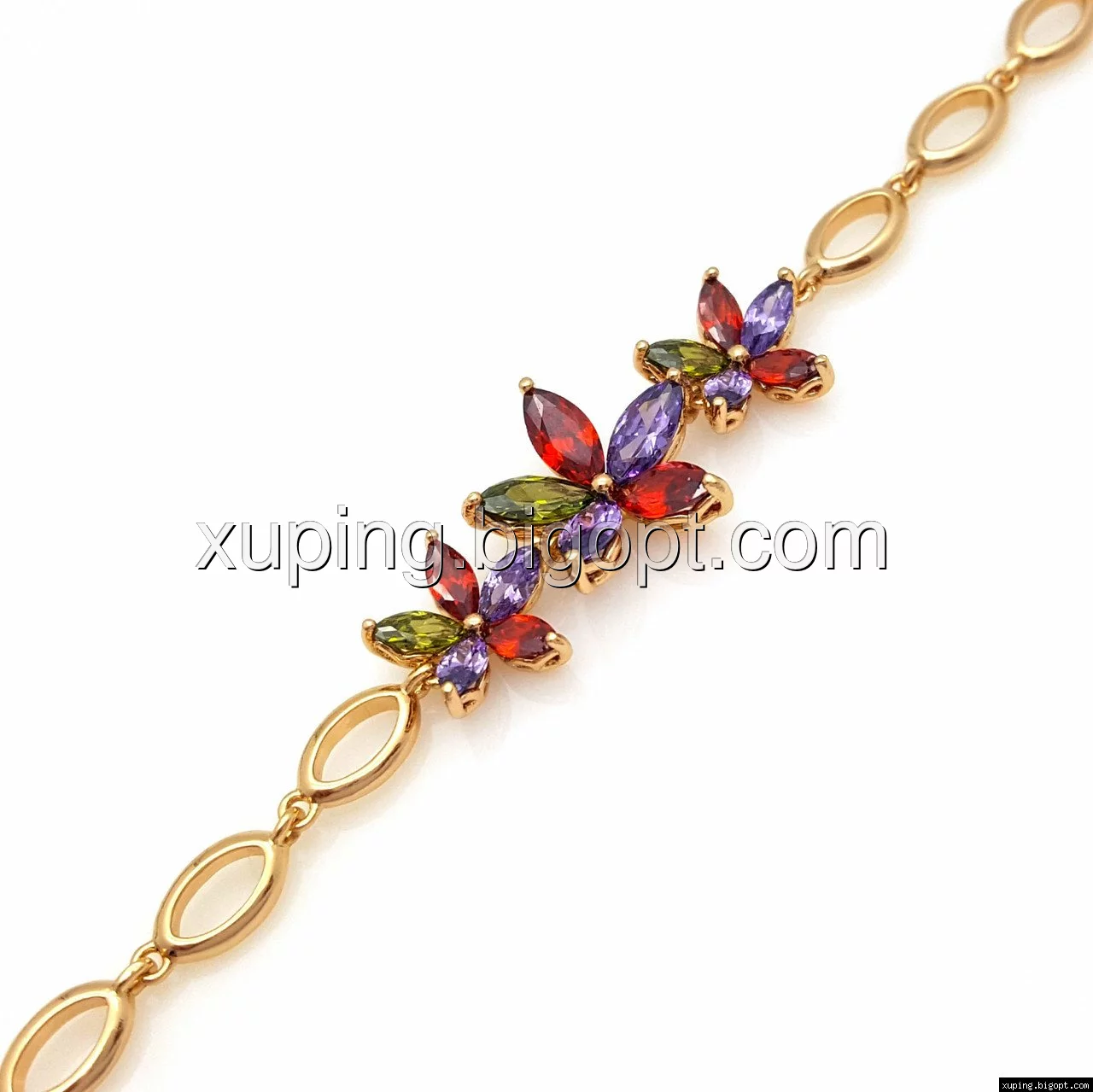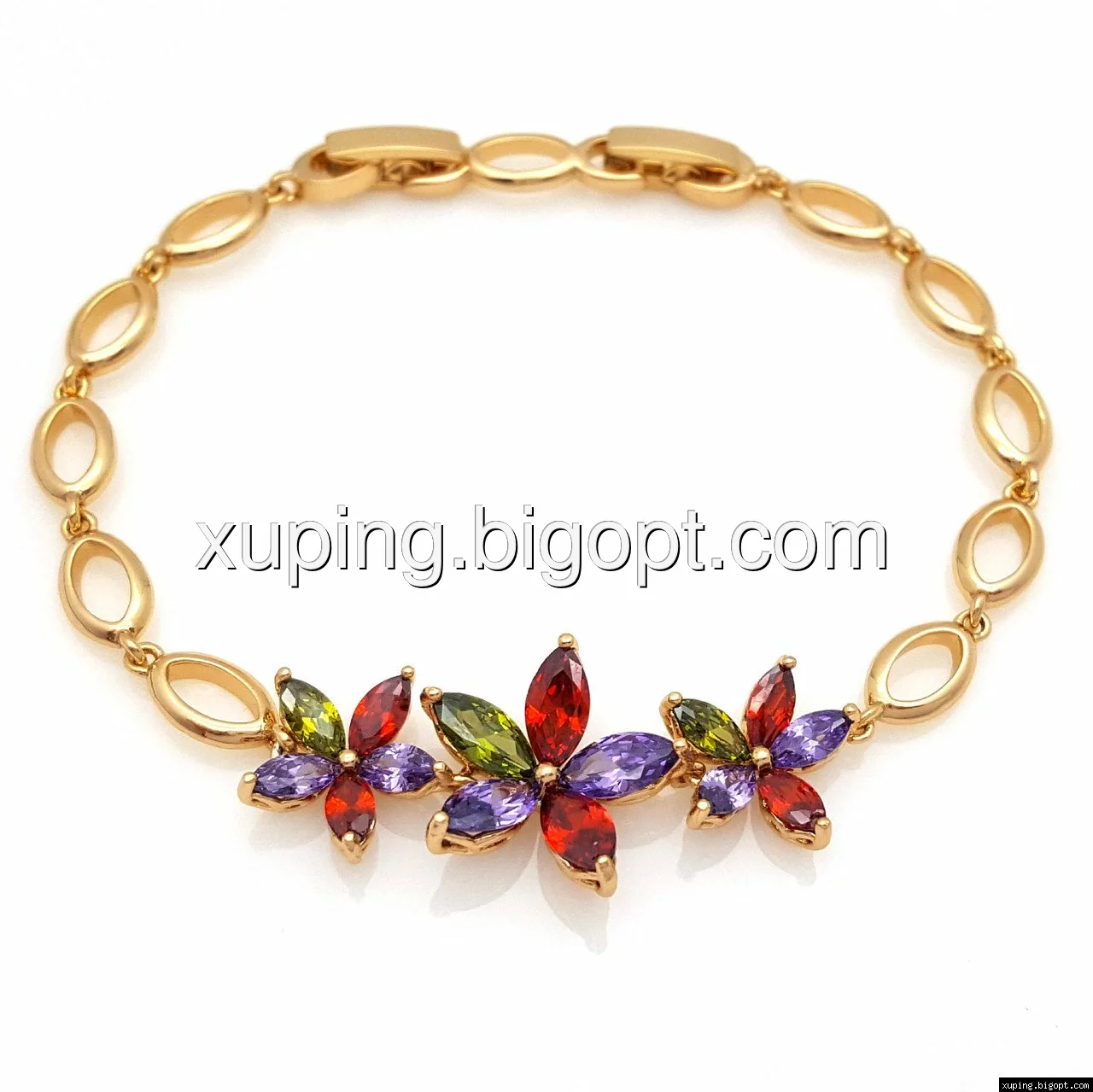 Браслет Три Цветка с разноцветным цирконием, р.17,5, р.19,5, позолота Xuping
