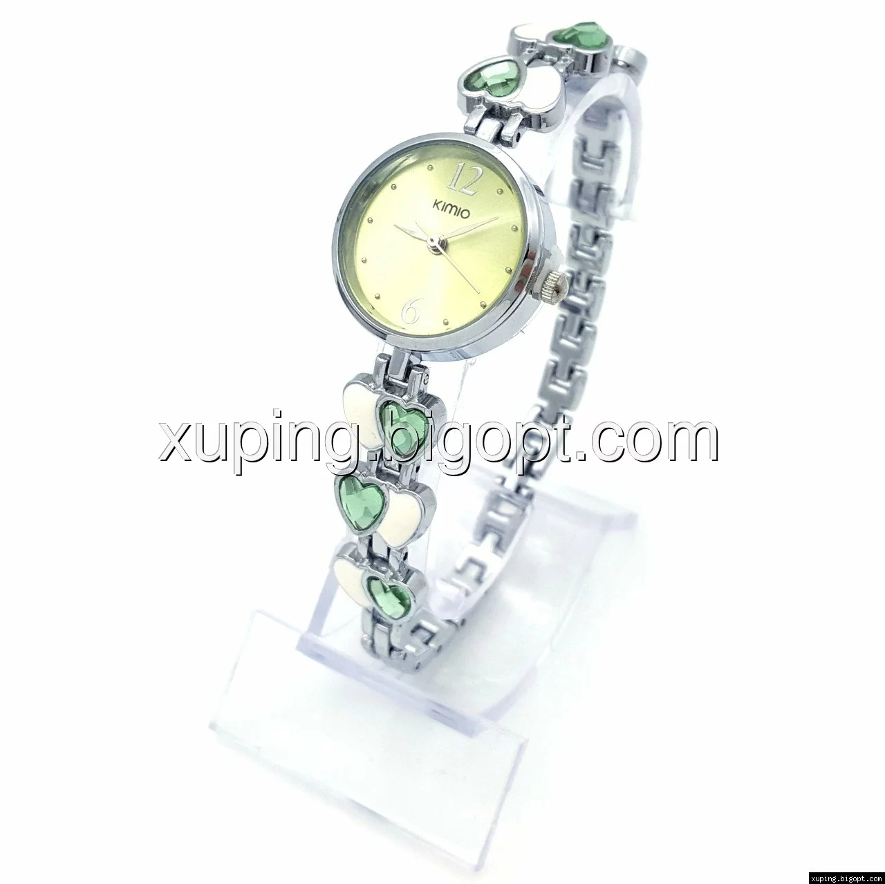 Часы KIMIO под серебро, браслет в сердечки с зелеными камнями, длина 21см, циферблат 23мм