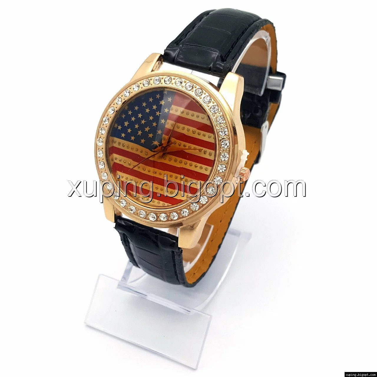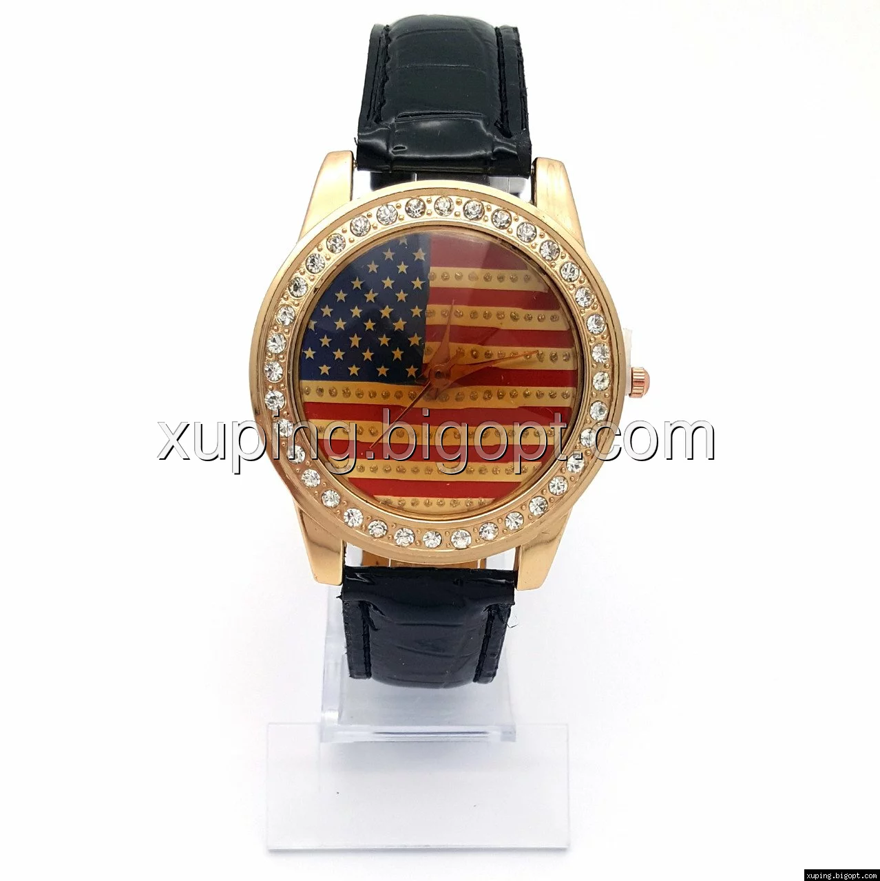 Часы с Американским флагом в стразах, на черном ремешке, длина ремешка 19-22см, циферблат - 42мм