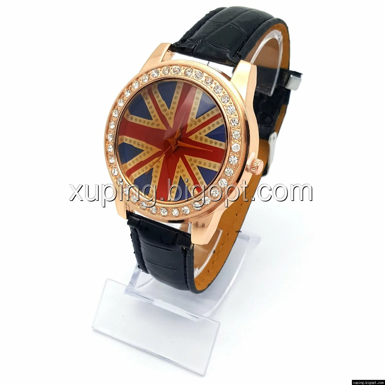 Часы с Английским флагом в стразах, на черном ремешке, длина ремешка 19-22см, циферблат - 42мм