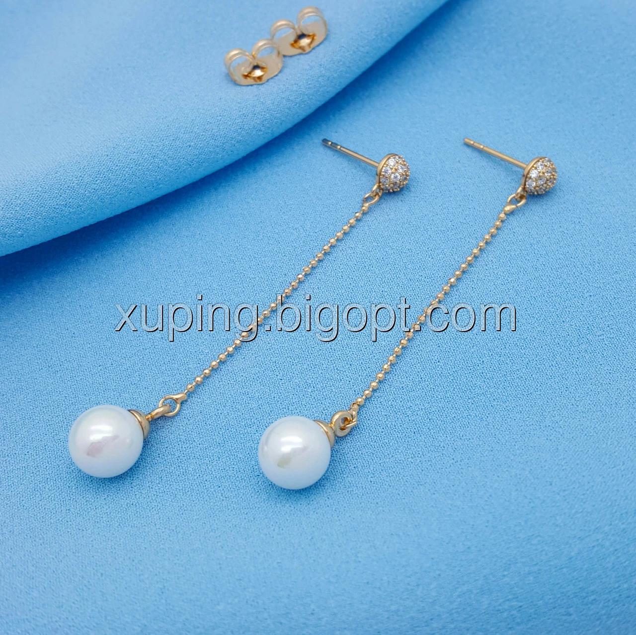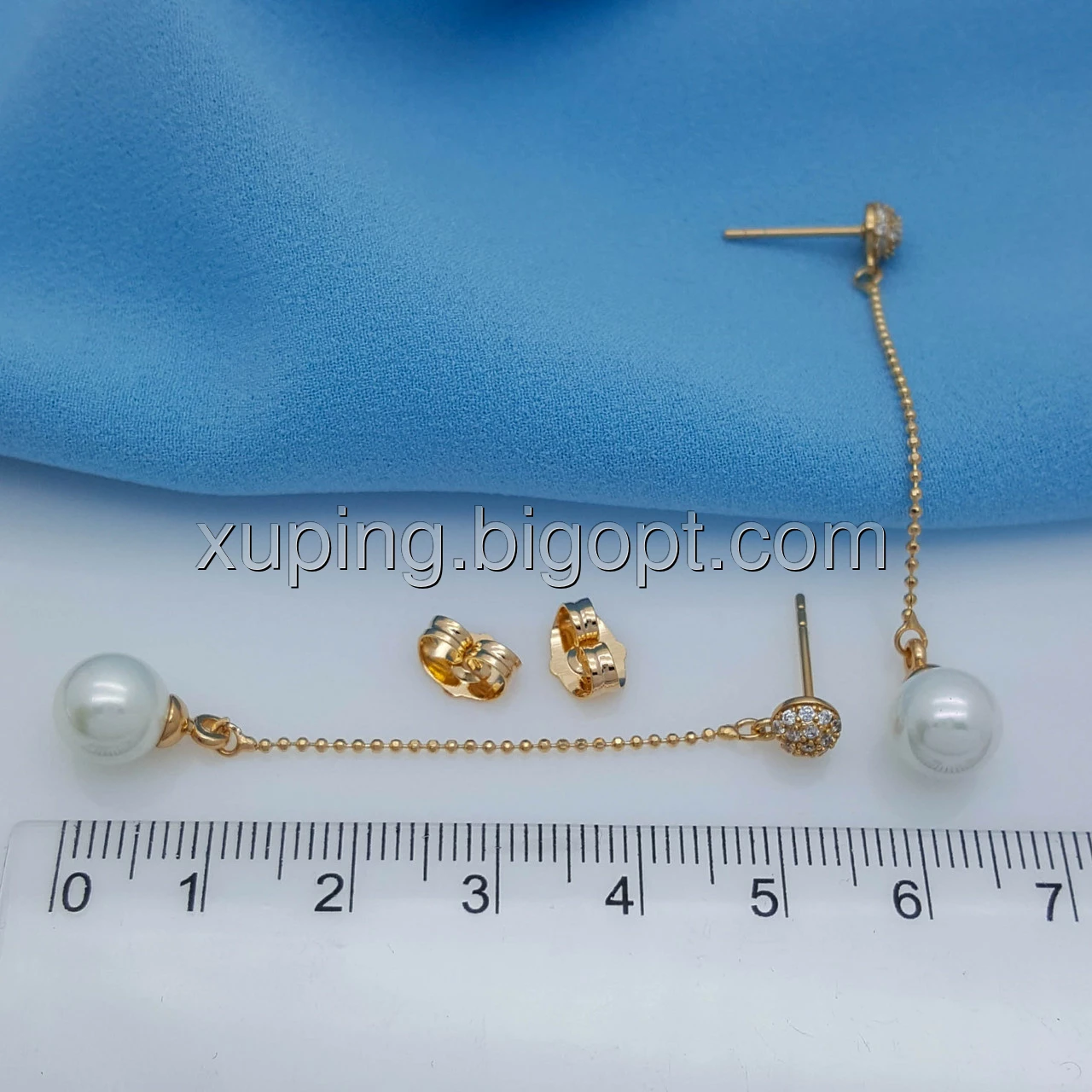 Сережки гвоздики, Перлинка на ланцюжку, з цирконієм, позолота Xuping