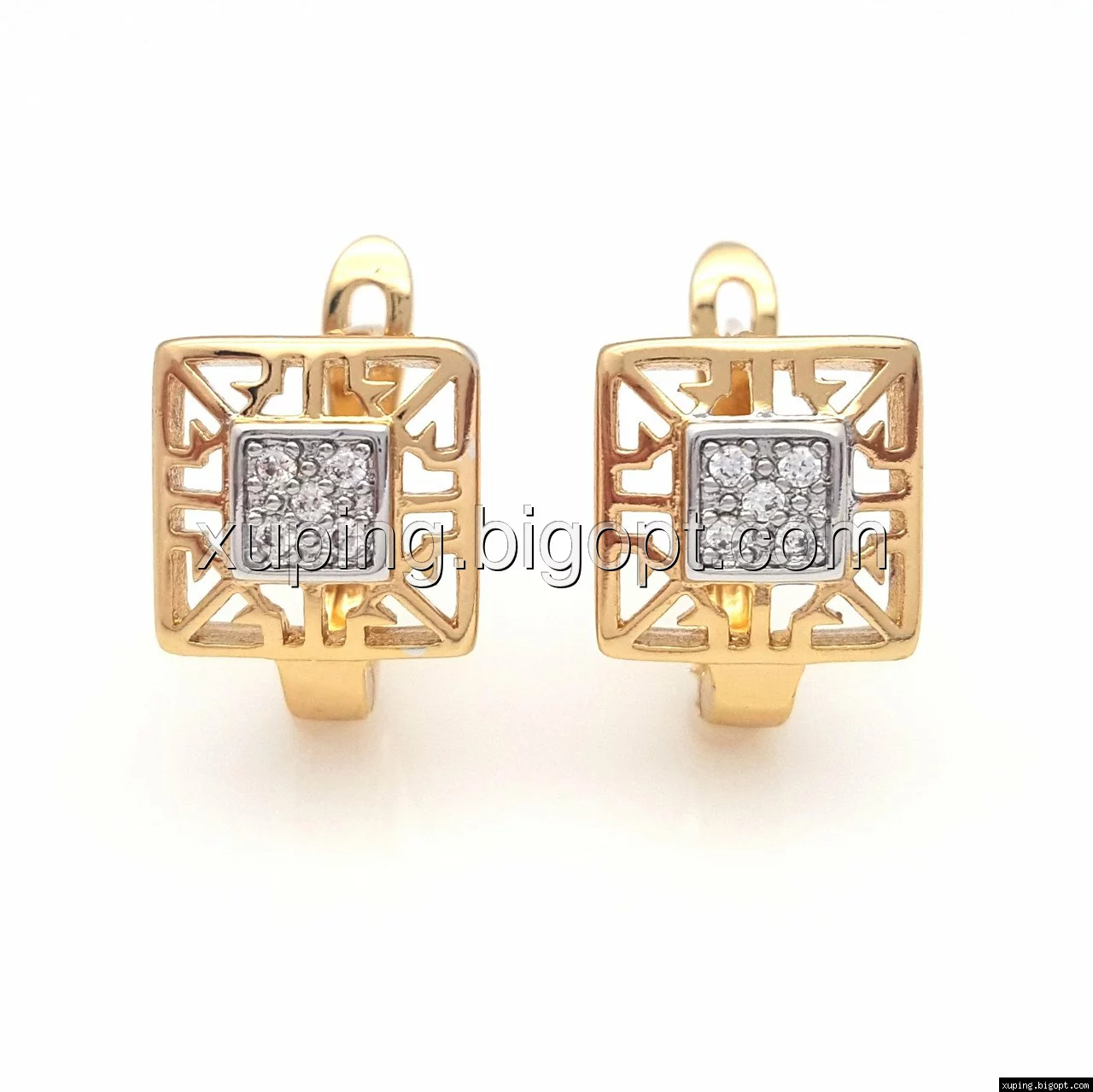 Серьги Ажурный Квадрат, с цирконием, англ.замок, позолота+родий