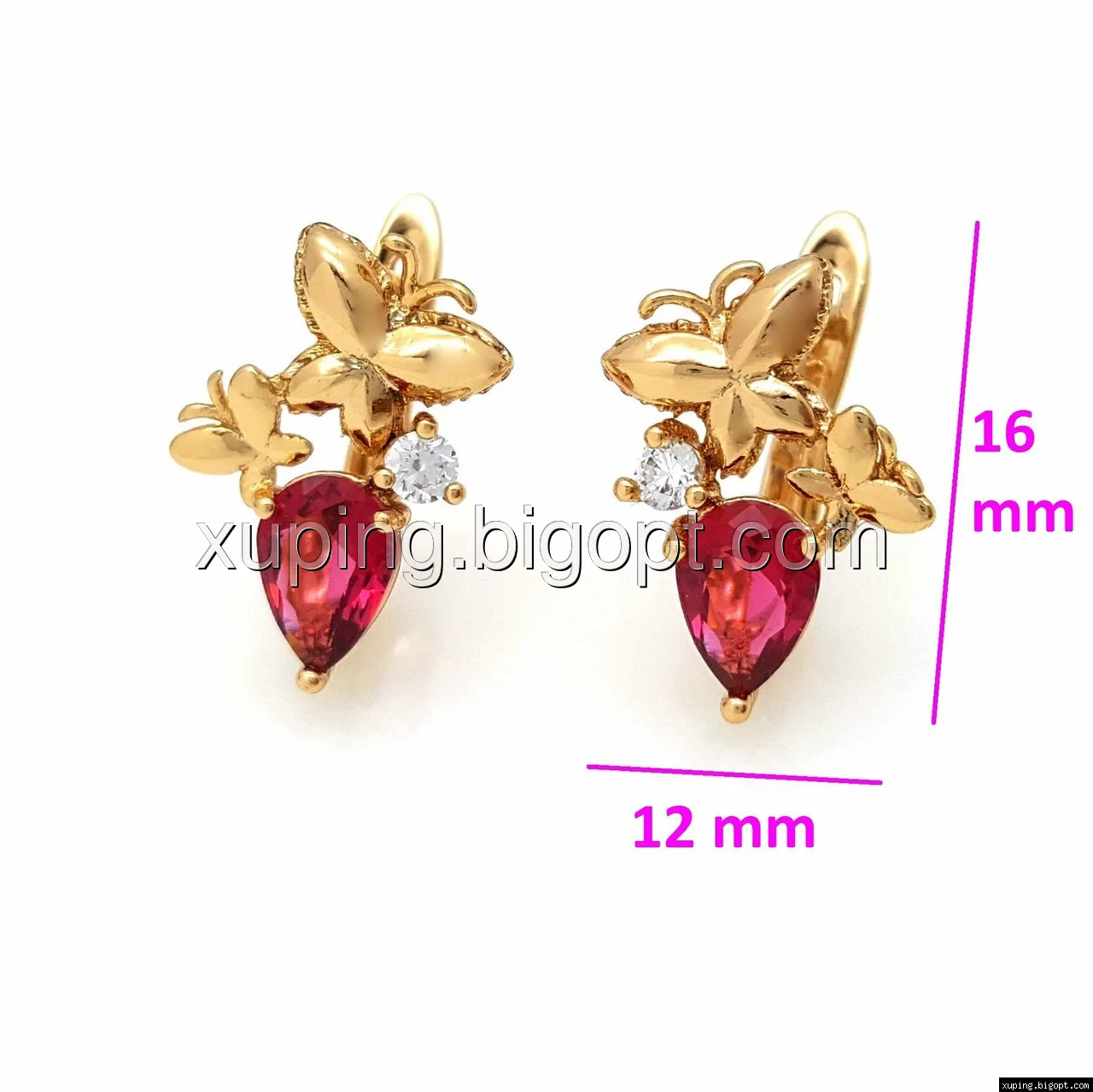 Сережки Два Метелика з рубіновим цирконієм, англ.замок, позолота Xuping, 18К