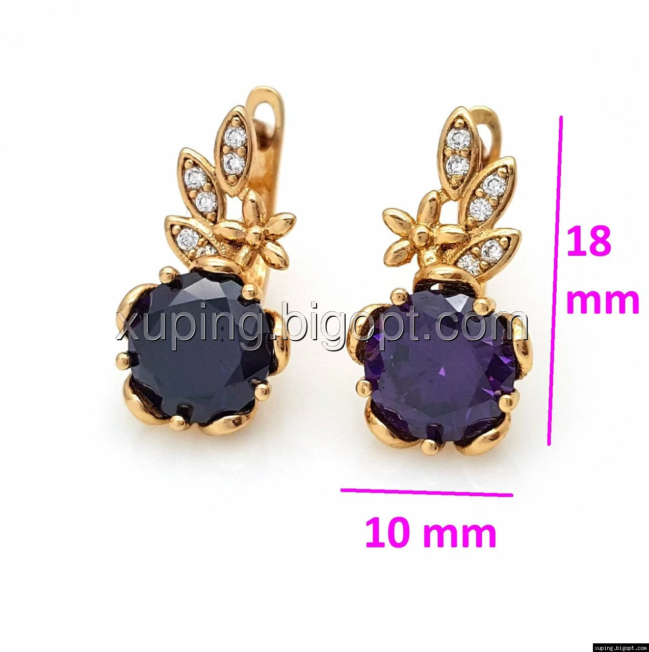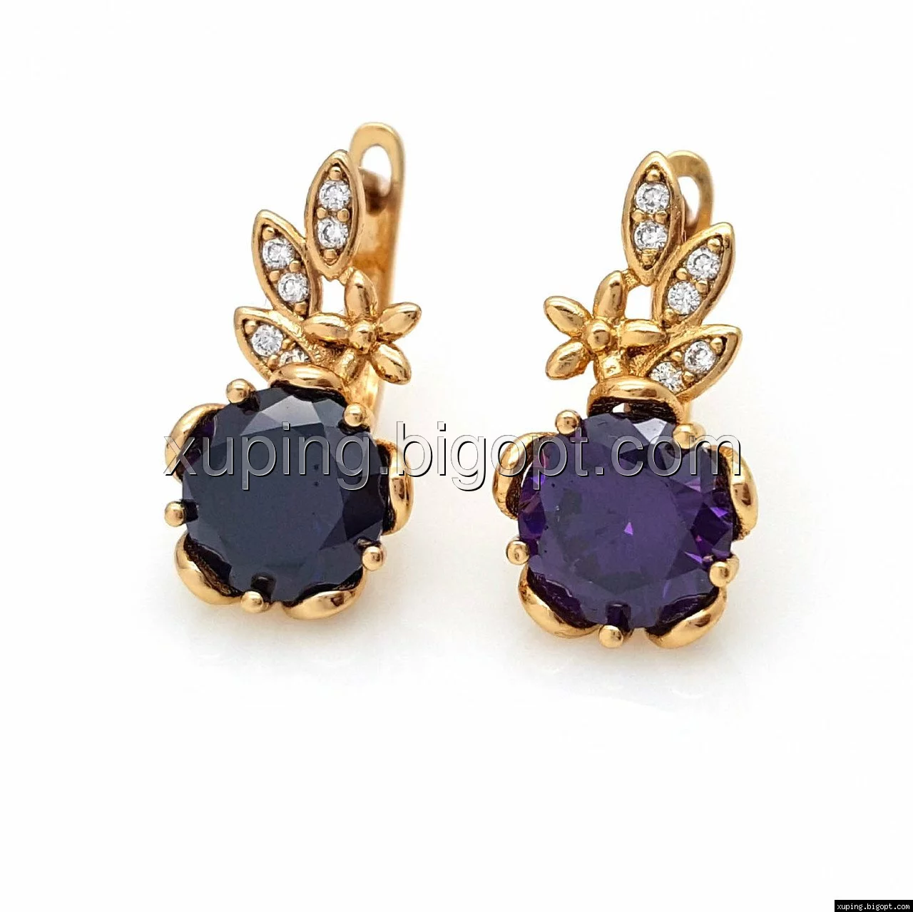 Серьги Два Цветка с фиолетовым цирконием, англ.замок, позолота Xuping