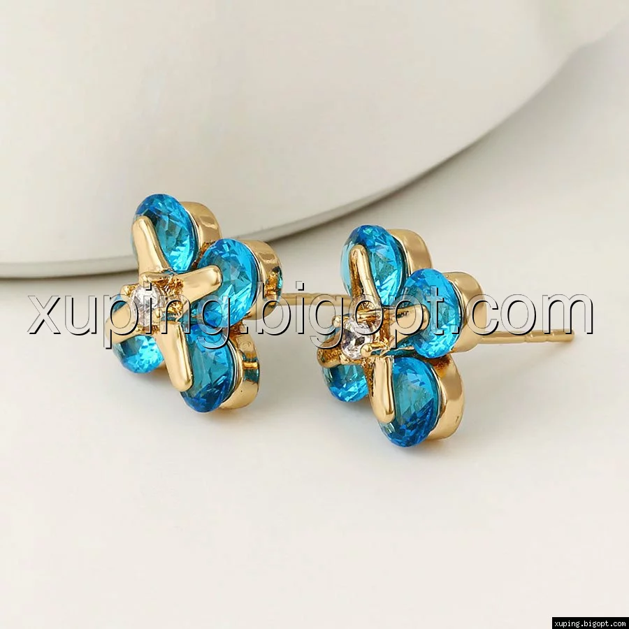 Серьги гвоздики, Четырехлистник с голубым цирконием, позолота