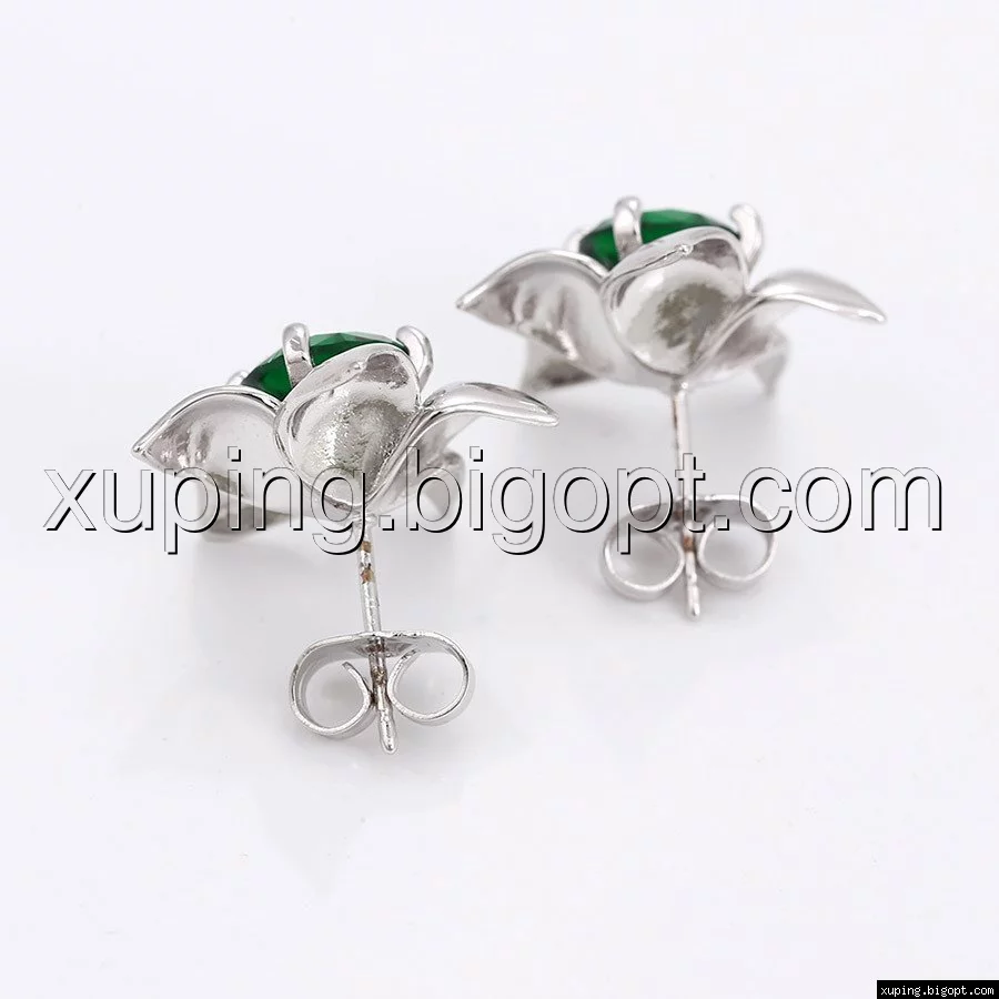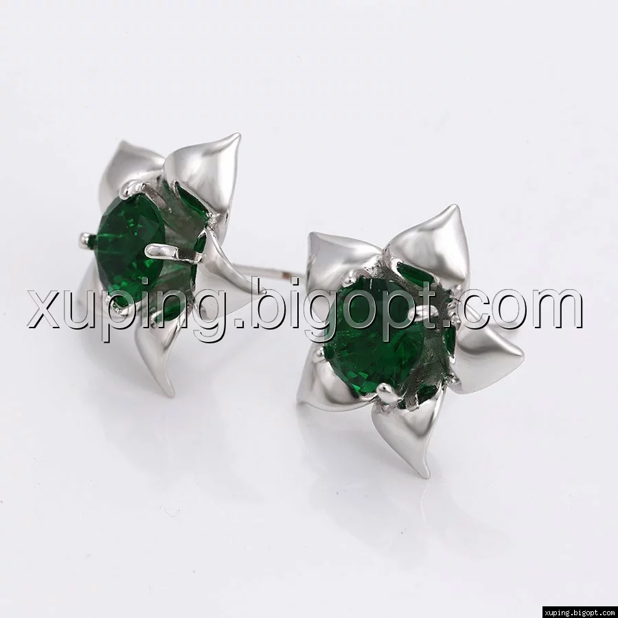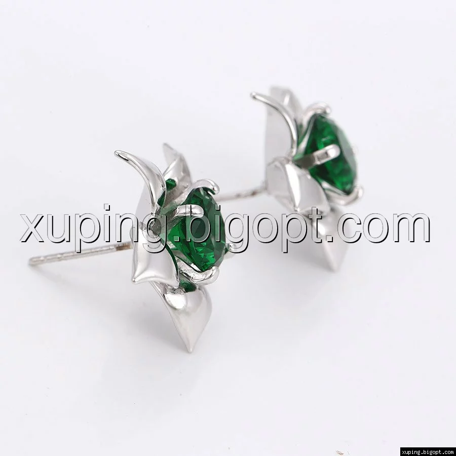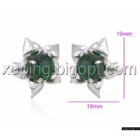 Серьги гвоздики Большой цветок с зеленым цирконием, родий