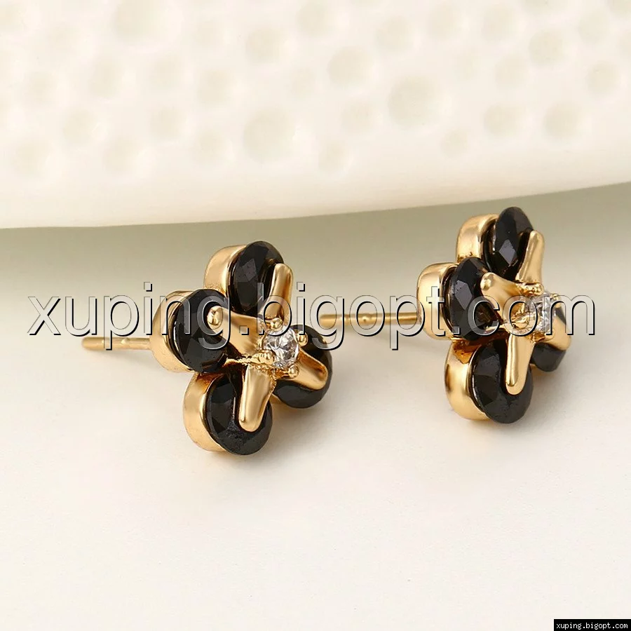 Серьги гвоздики, Цветок с черным цирконием, позолота