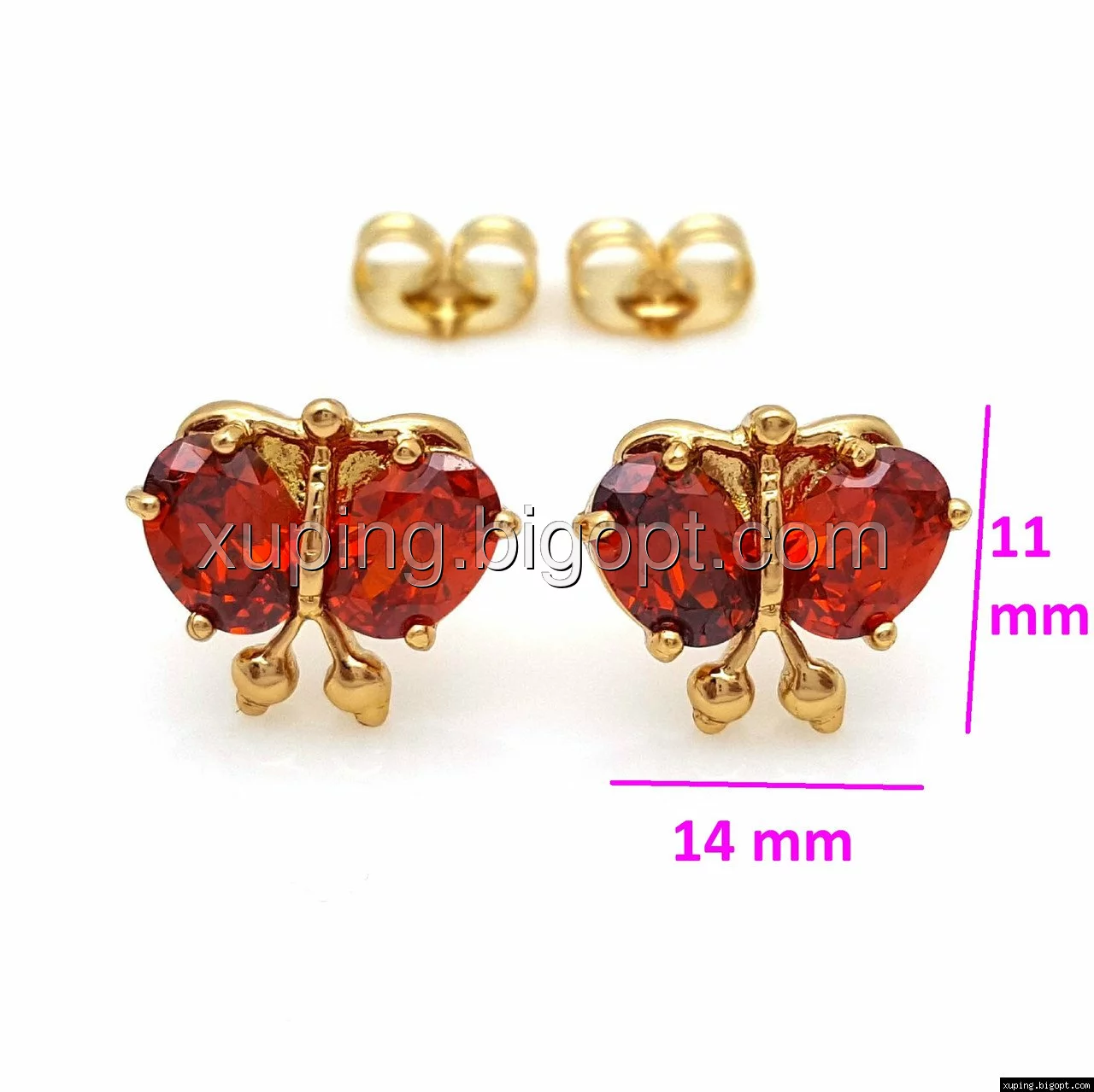 Серьги гвоздики, Бабочка с красным цирконием, позолота