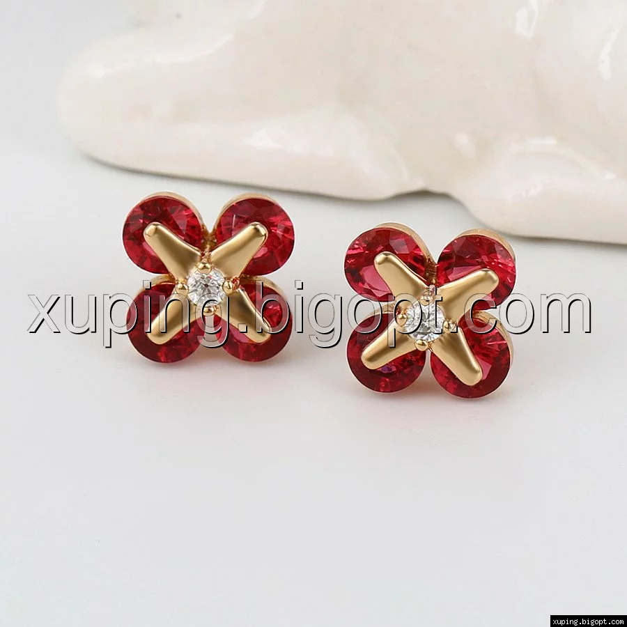 Серьги гвоздики , Четырехлистник с красным цирконием, позолота