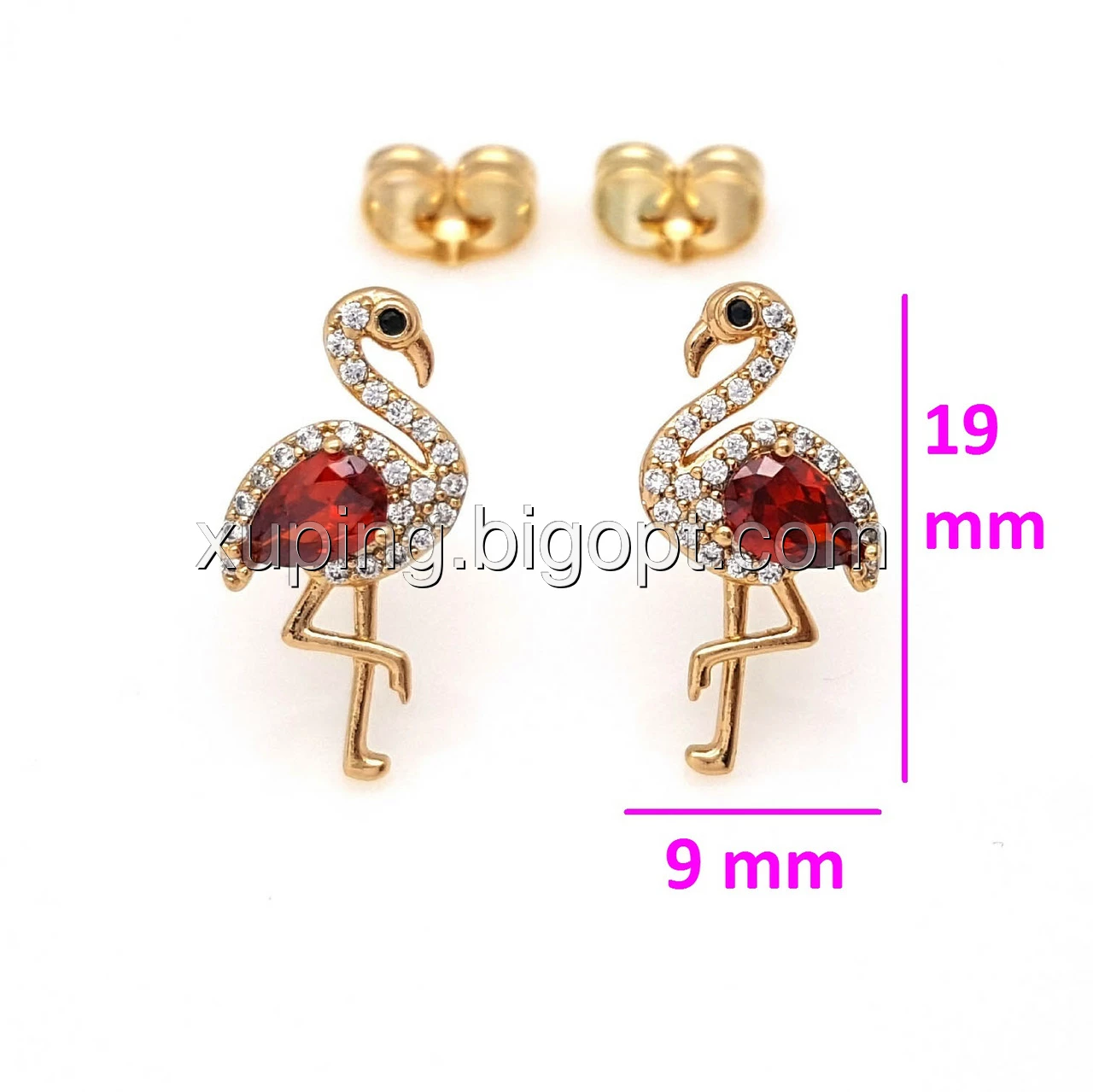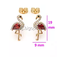 Сережки цвяшки, Фламінго з червоним цирконієм, позолота Xuping