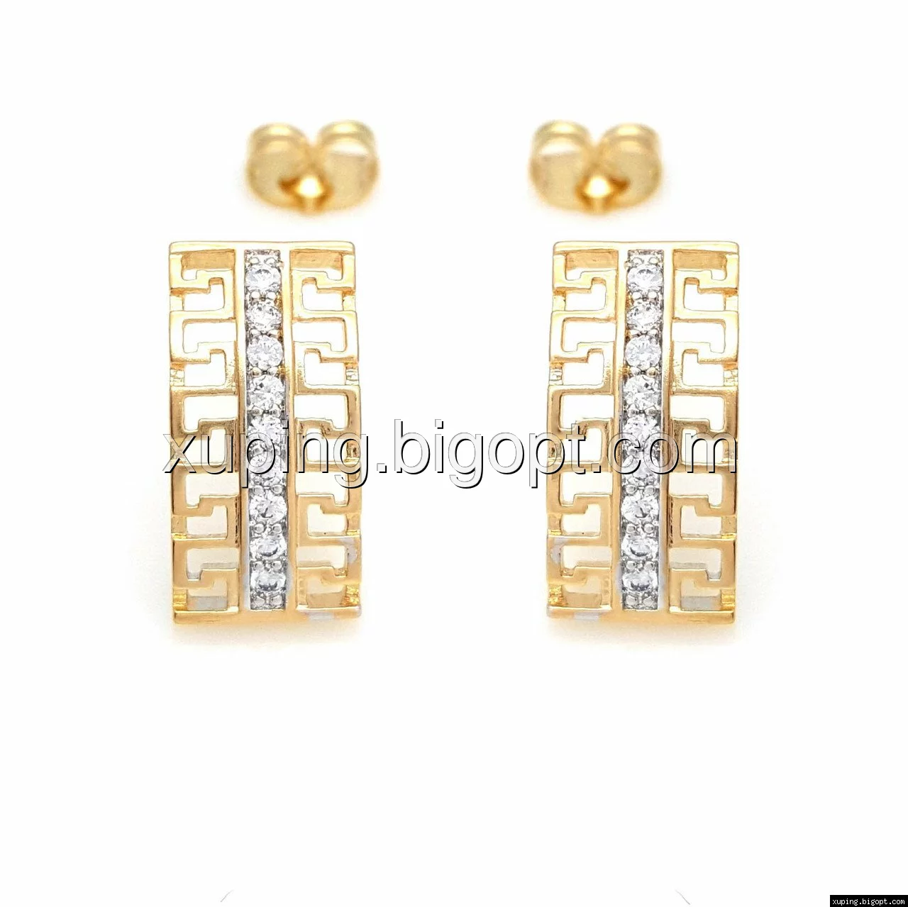 Серьги гвоздики, с греческим рисунком и дорожкой циркония, позолота