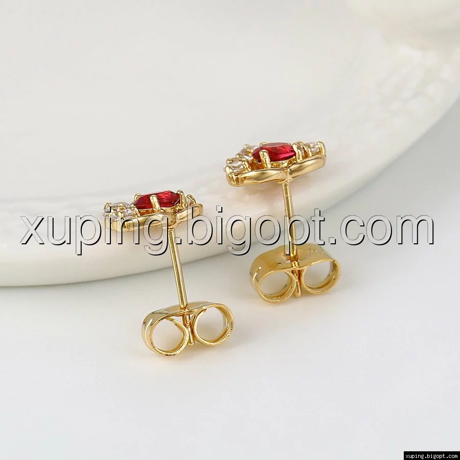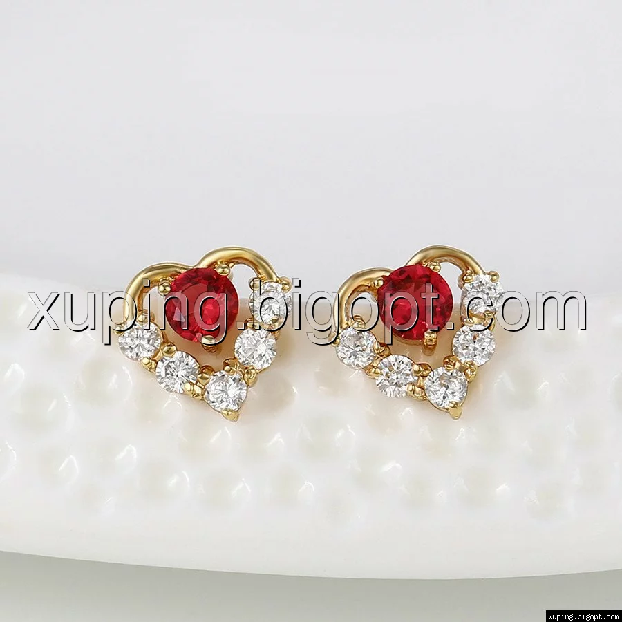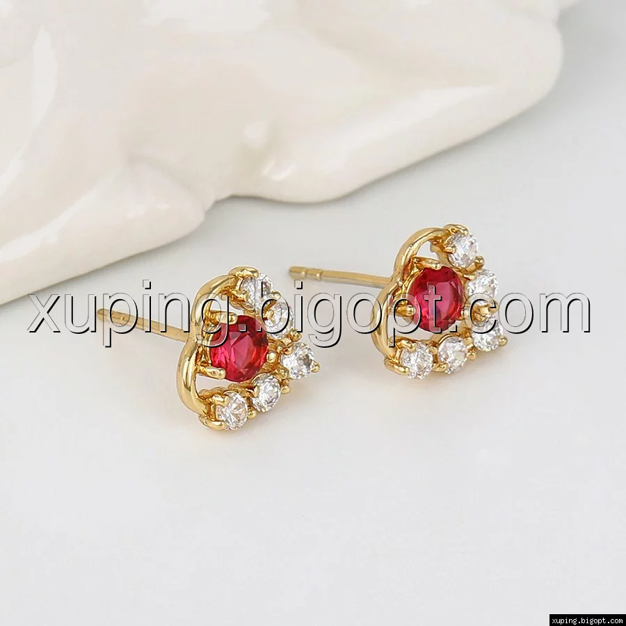 Серьги гвоздики, Сердце с рубиновым цирконием, позолота